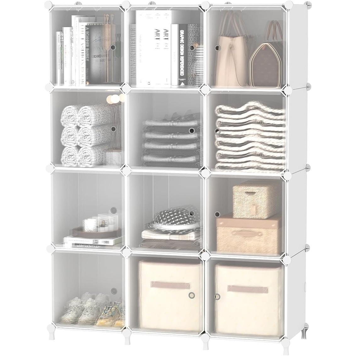 12 Cube Storage Shelves with Doors, Stackable Closet Organizer for Bedroom, Home Office, White
