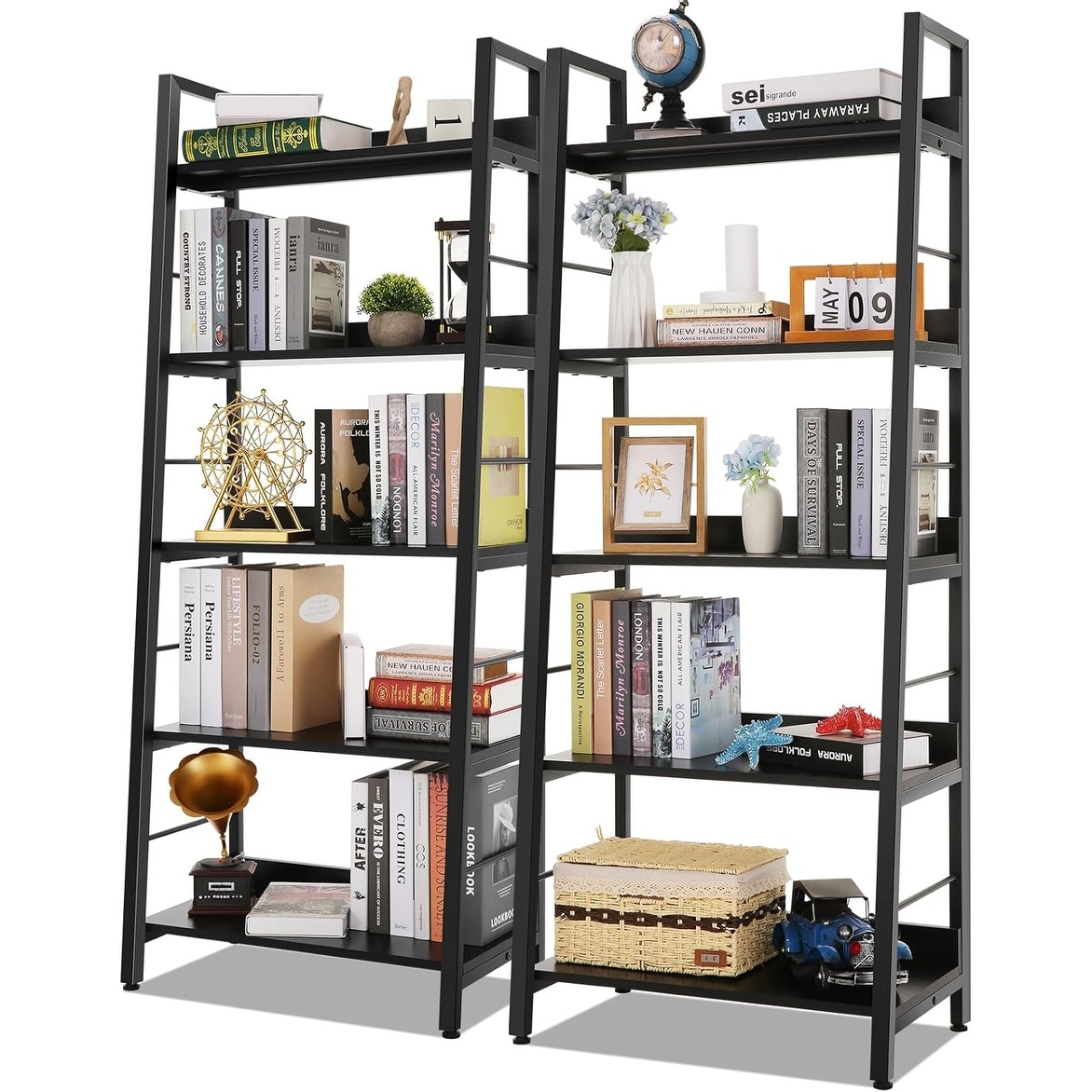 5-Tier Industrial Ladder Bookshelf - Wood & Metal Storage Shelf for Living Room, Bedroom, Office (2 Pack)