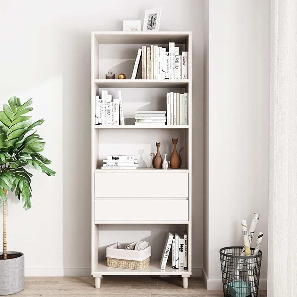 White Mid-Century Bookcase with Legs - 67 Inch Tall Open Shelves & Double Drawers for Home Office