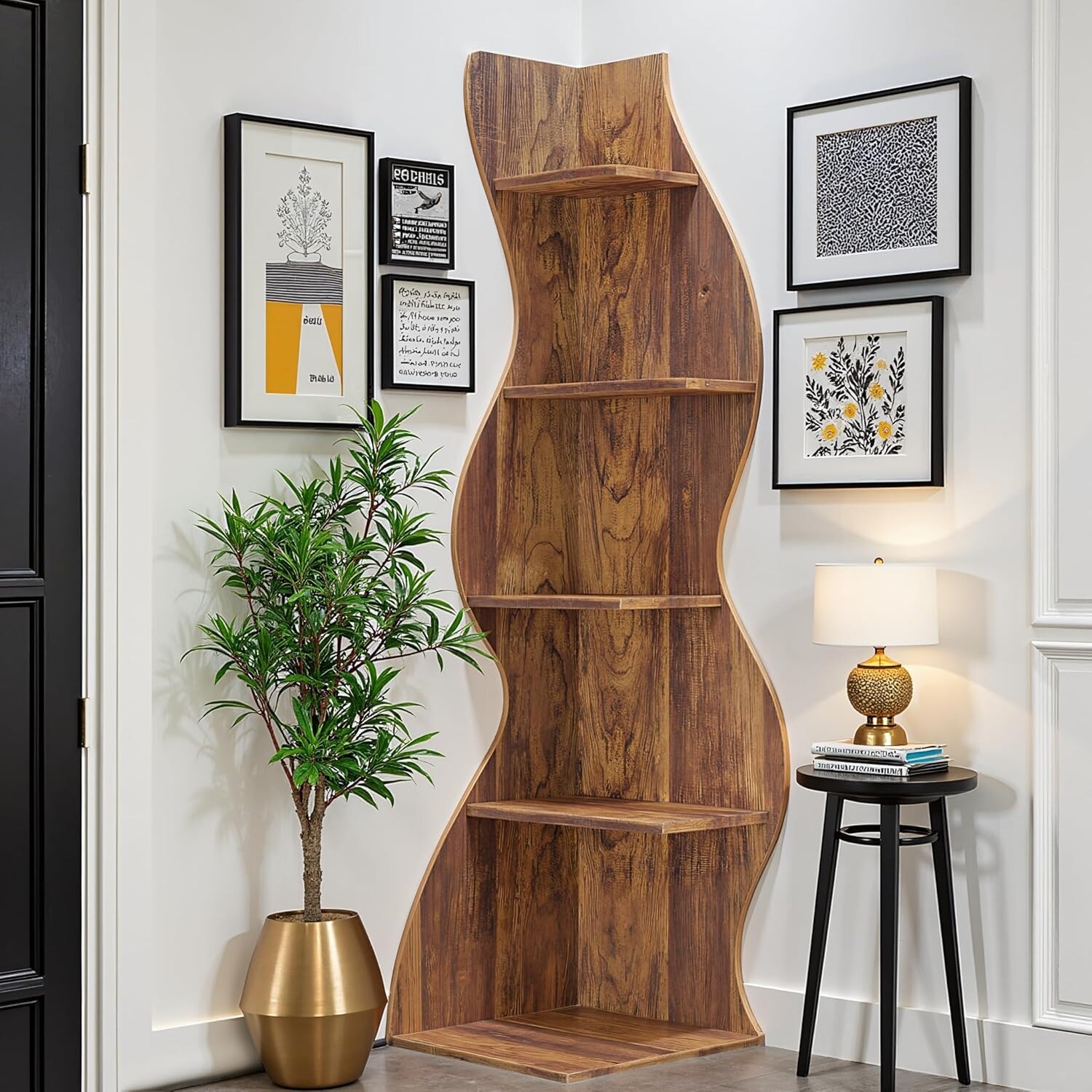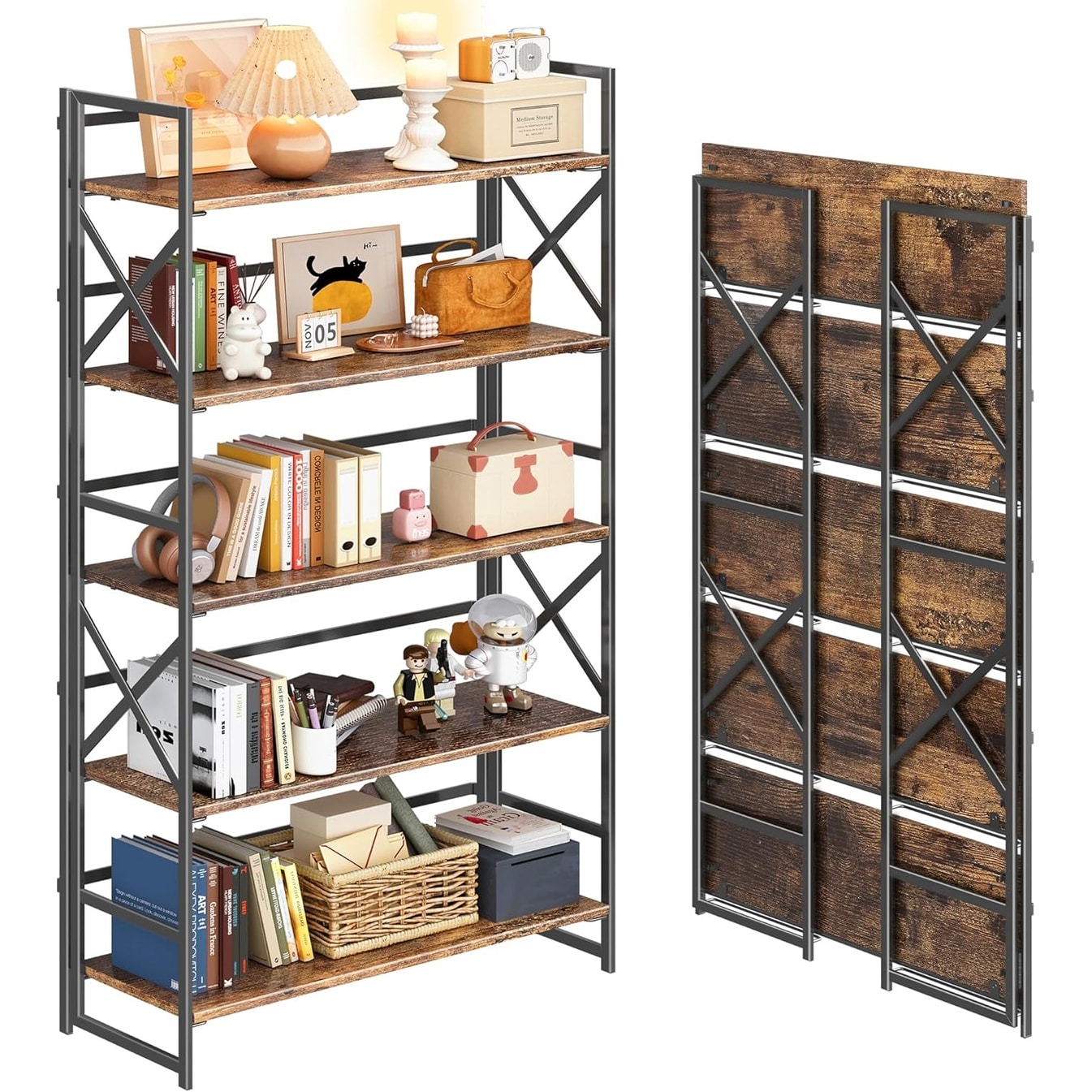 Extra Wide 5-Tier No Assembly Folding Bookshelf, 51.2 Inches, Rustic Brown Black