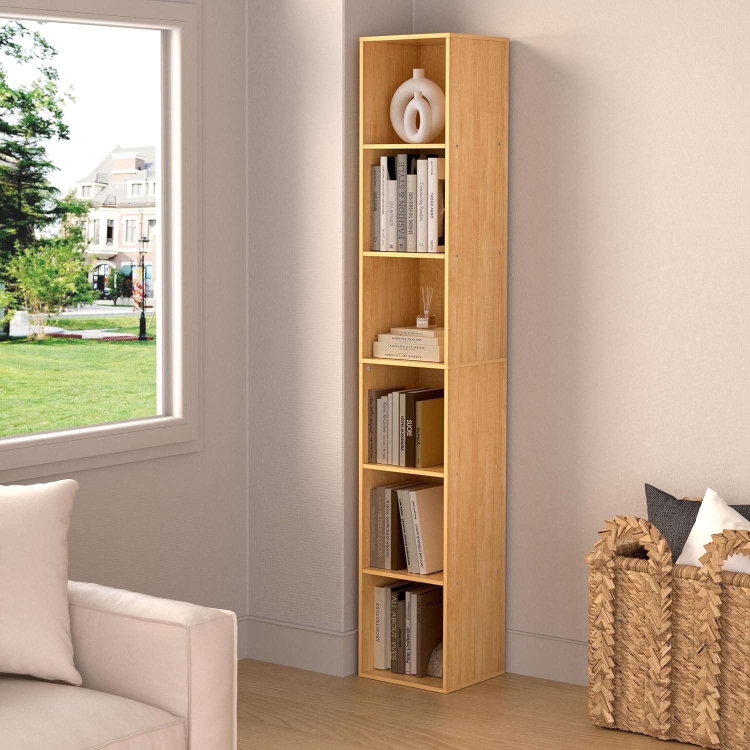 6-Tier Vertical Cube Storage Organizer with Closed Back Panel, Oak Finish, Space-Saving for Living Room, Bedroom, Office