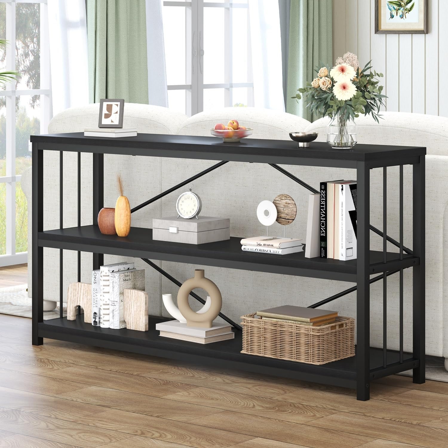 Modern 3-Tier Horizontal Wood and Metal Bookshelf for Home Office, Bedroom, or Living Room, 55 Inch