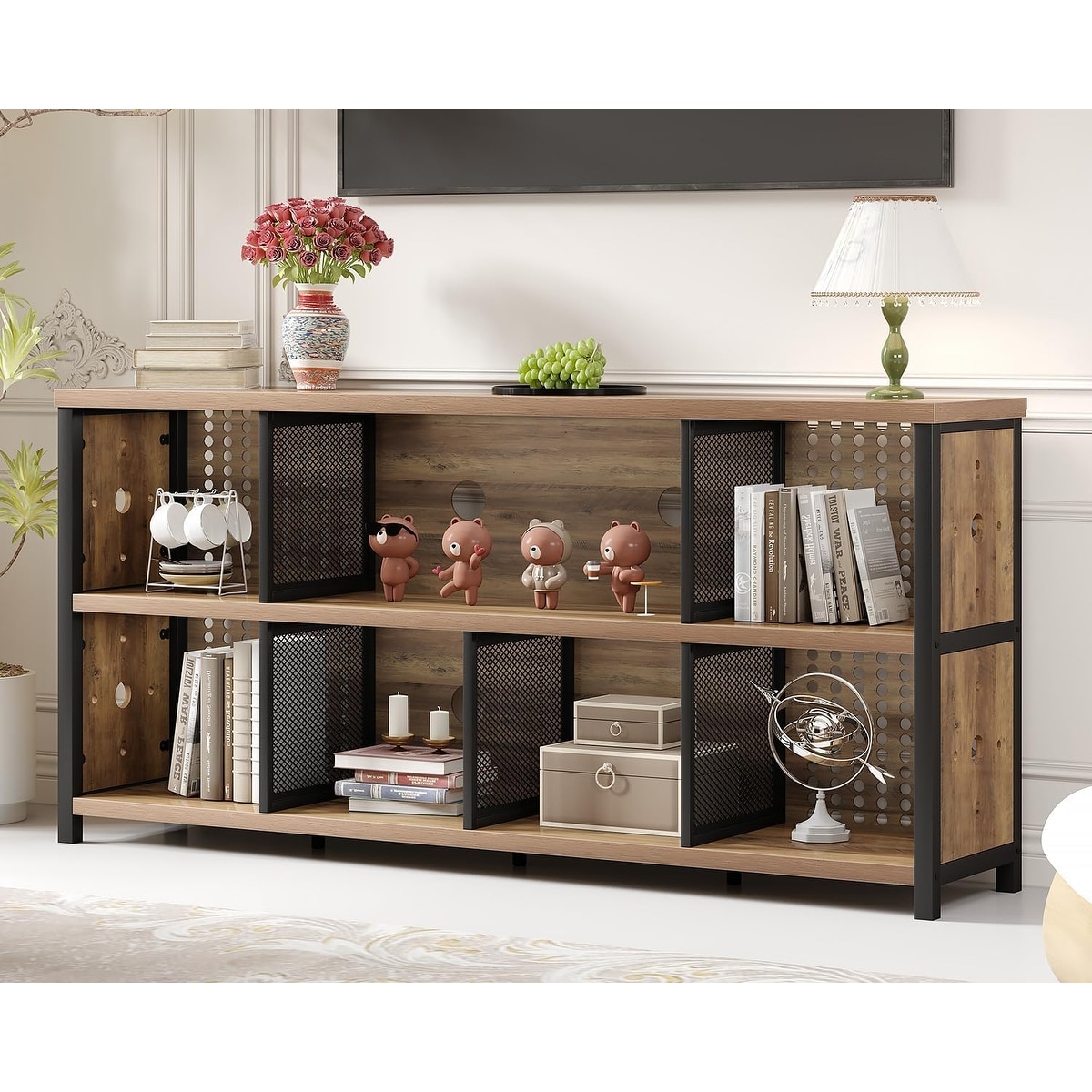 Rustic 6-Cube Storage Organizer Shelf with 3 Bins, Industrial Metal Frame Bookcase for Living Room and Office, Brown