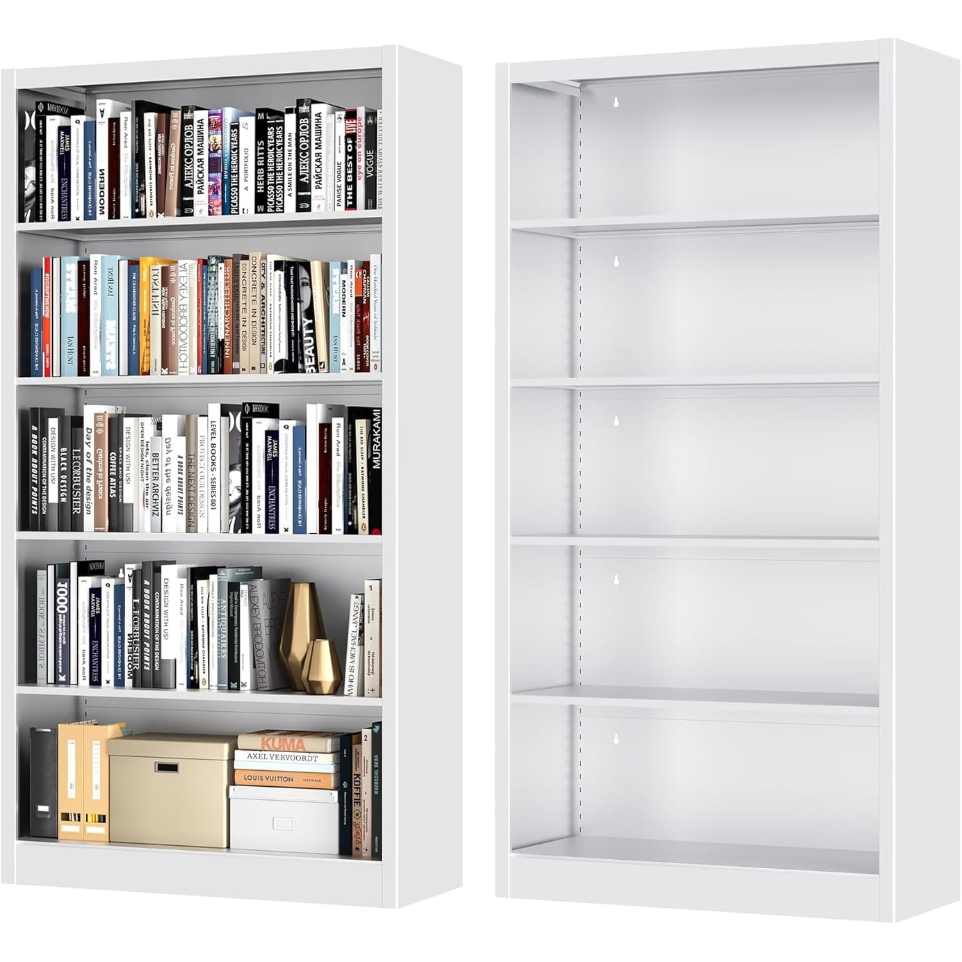 5-Tier White Metal Bookcase, 66-inch Tall Adjustable Shelves, Sturdy Freestanding Storage Shelf for Home Office Living Room