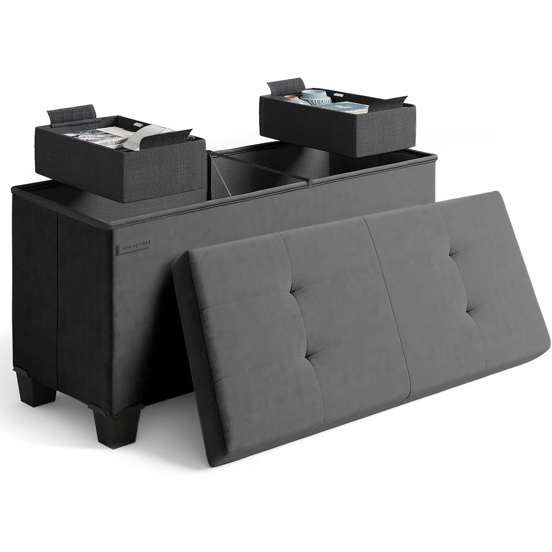Storage Bench with Bins, 30-in Foldable Foot Rest for Bedroom or Living Room, Velvet, Grey