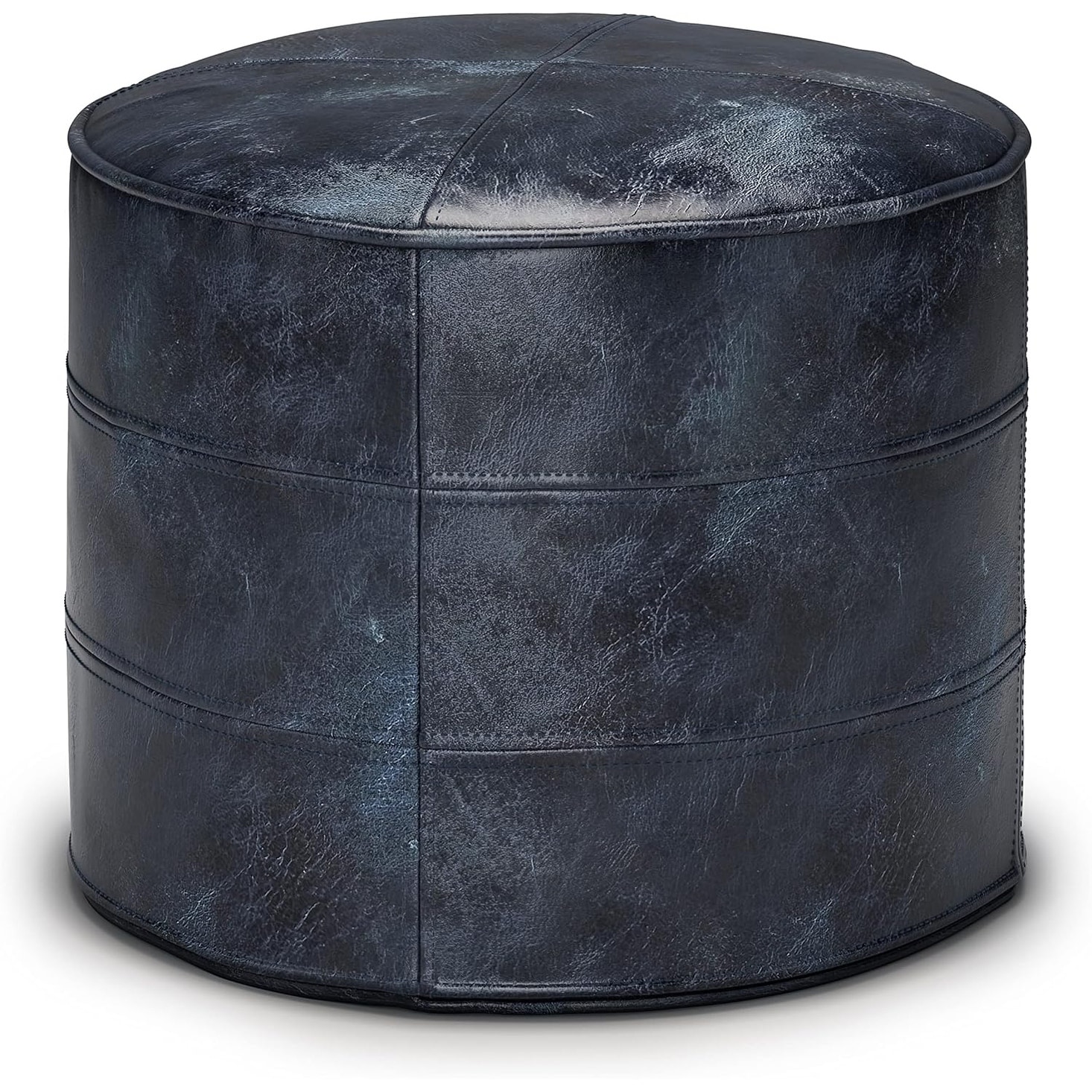 Connor Boho Round Pouf in Distressed Navy Blue Genuine Leather for the Living Room, Bedroom and Kids Room