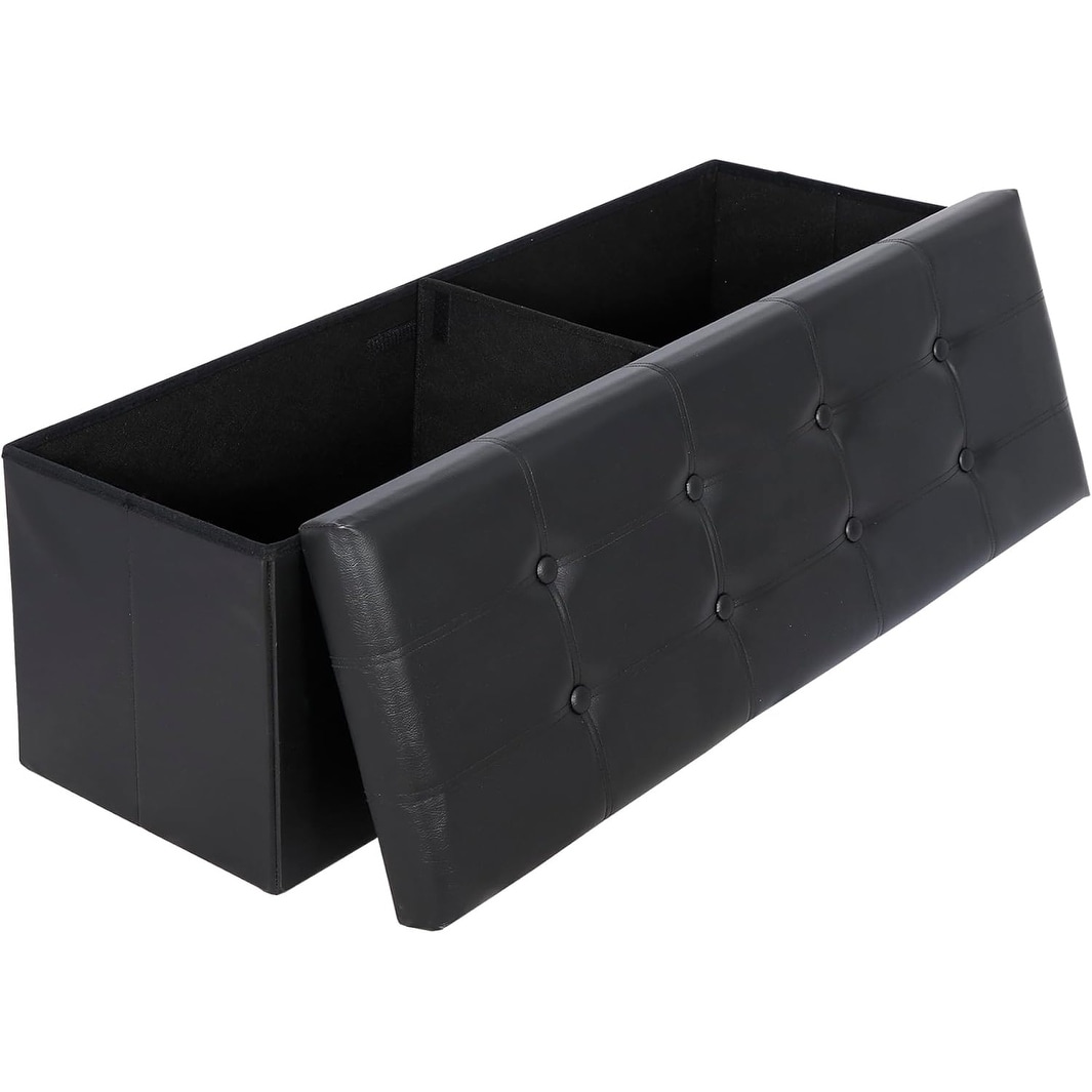 43" Folding Storage Bench, Faux Leather Ottoman with Footrest for Bedroom, Living Room, Office, Entryway, Black