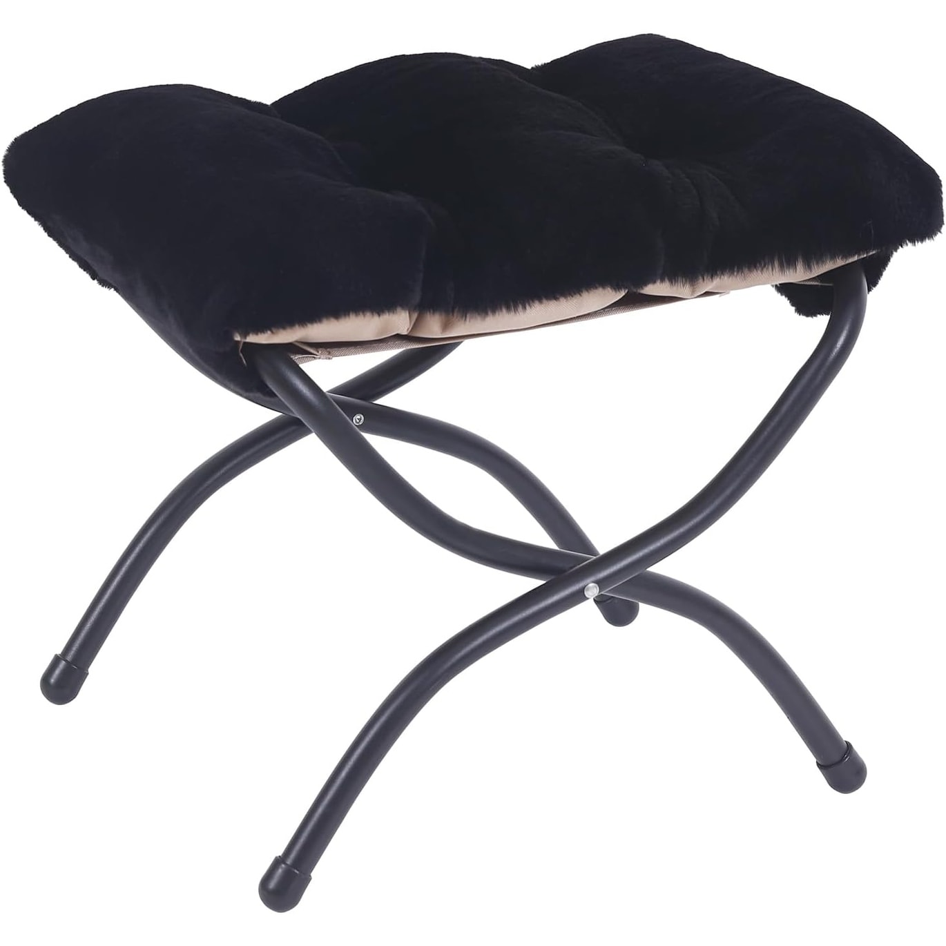 Folding Upholstered Footrest Stool, Modern Portable Accent Ottoman with Detachable Cushion, Metal Frame, Plush Black