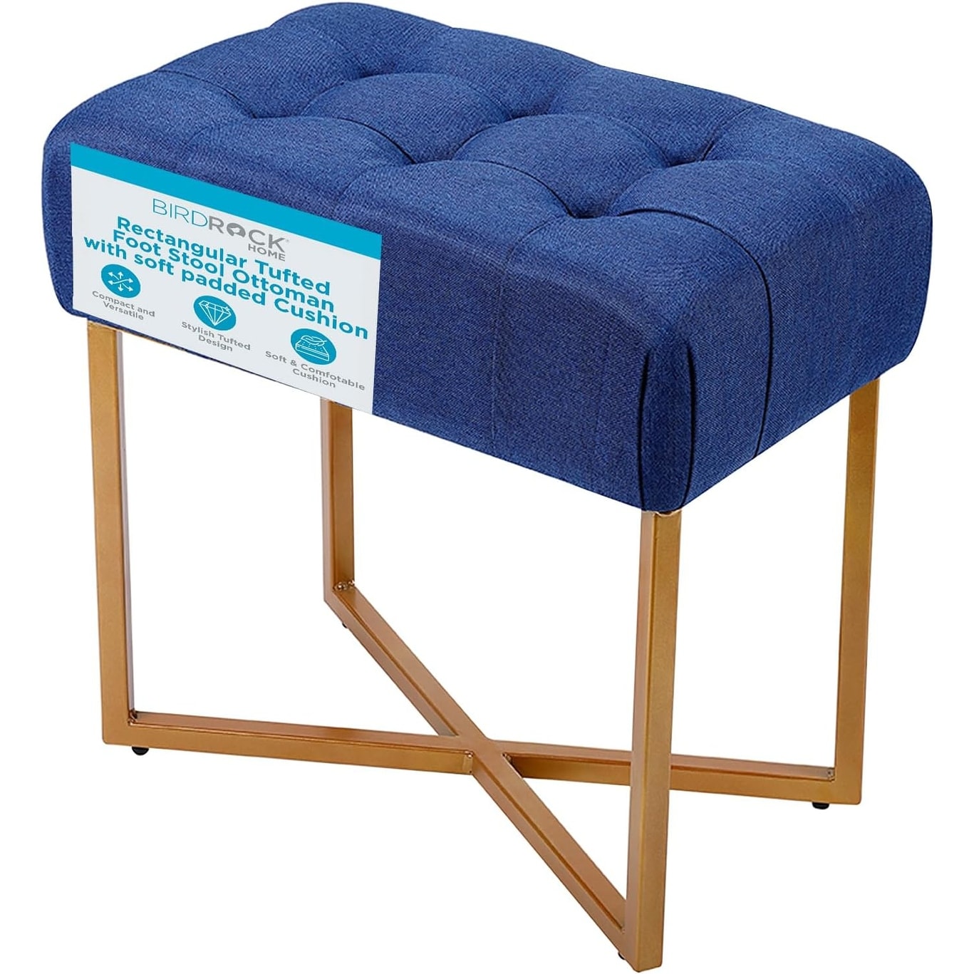 Blue Tufted Foot Stool with Pale Gold Legs - Soft Padded Ottoman for Bedroom, Living Room, or Bathroom - Compact Adult Seating