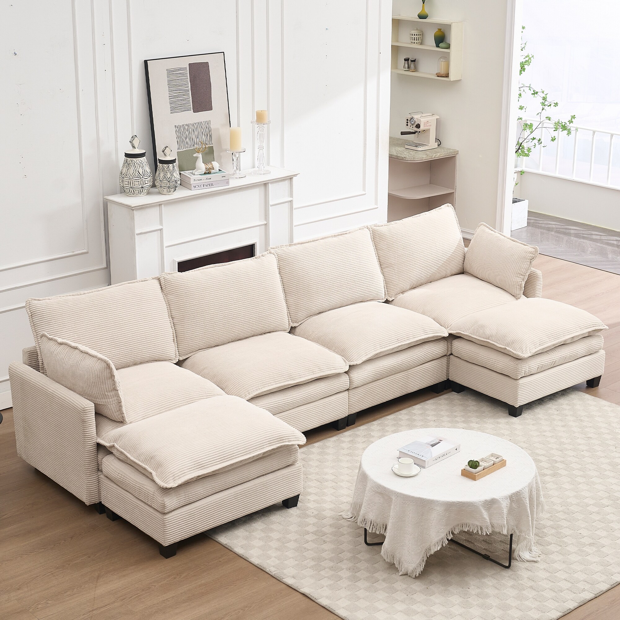 Boucle Fabric Convertible L Shape Sectional 4-seater Sofa Couch With Distinctive Shell-shaped Armrests And Removable Ottoman,Cyl