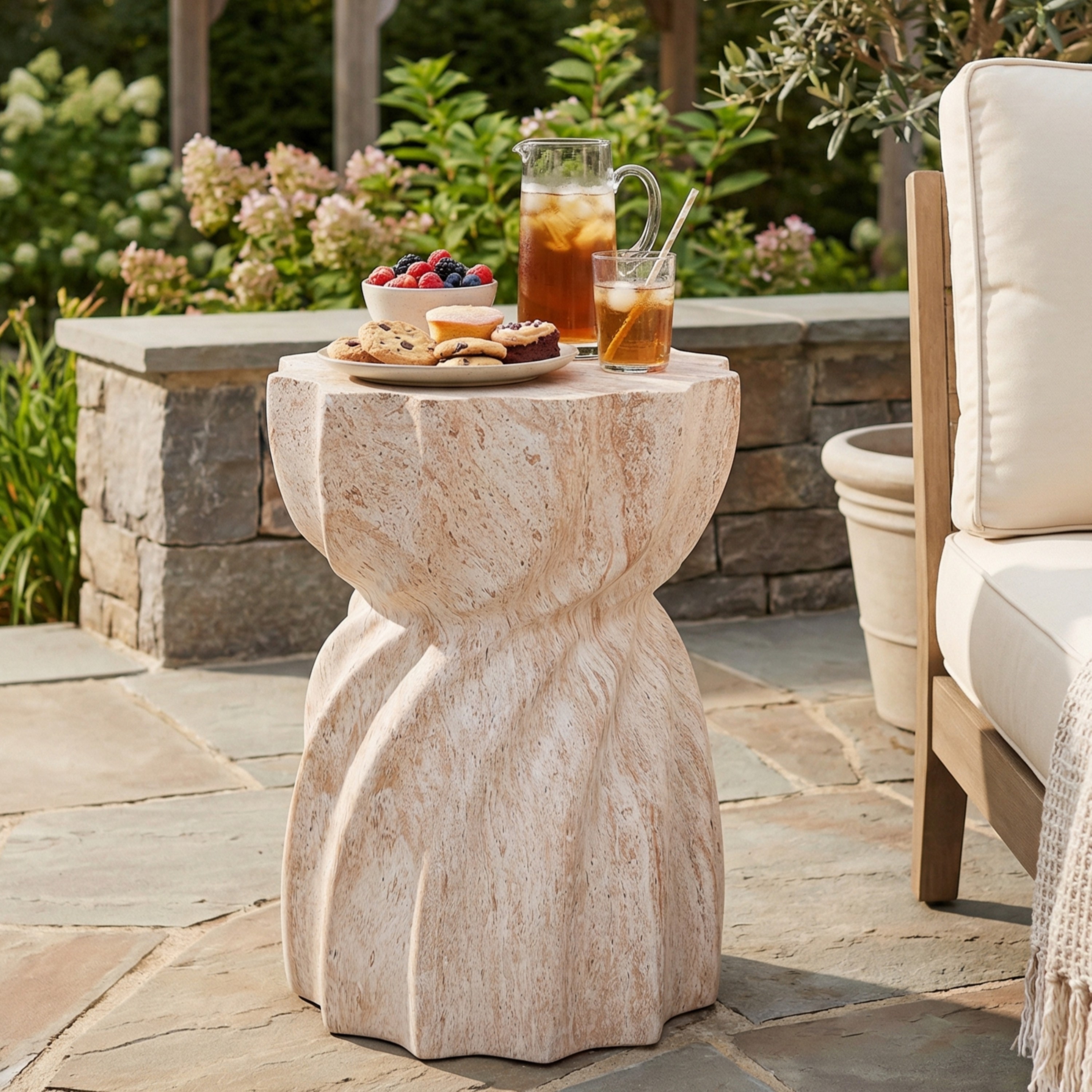 Outdoor/Indoor Lightweight Concrete Side Table,Hexagonal Round Travertine Accent Table - 18.75