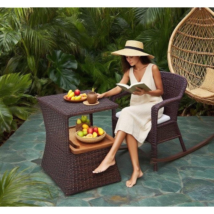 Outdoor Side Table With Umbrella Hole, Rattan Wicker End Table - 21.75