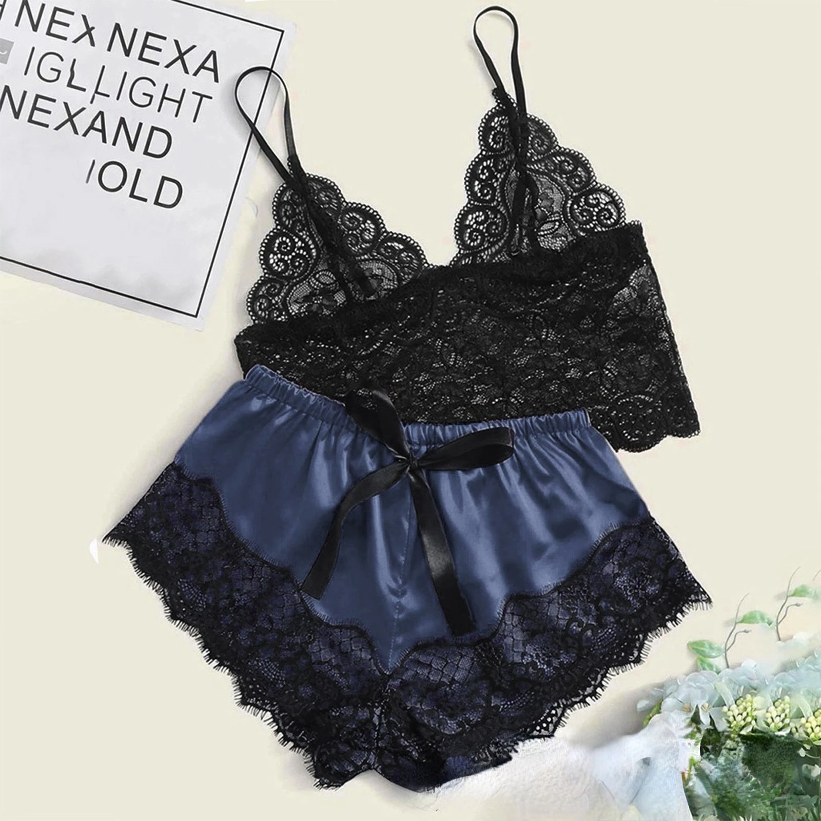 Lace Pajama Set, Sexy Sleepwear For Women, Top Shorts Lingerie, Comfortable Underwear Pajama Set navy l