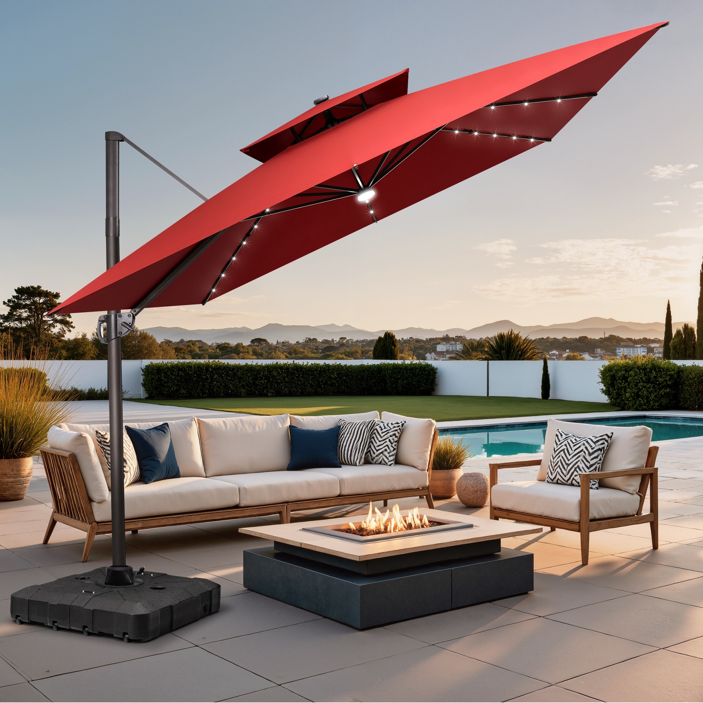 11 FT Square Outdoor Patio Cantilever Umbrella with Solar Lights All-Weather Wheeled Base Double Canopy 360 Rotation Tilt