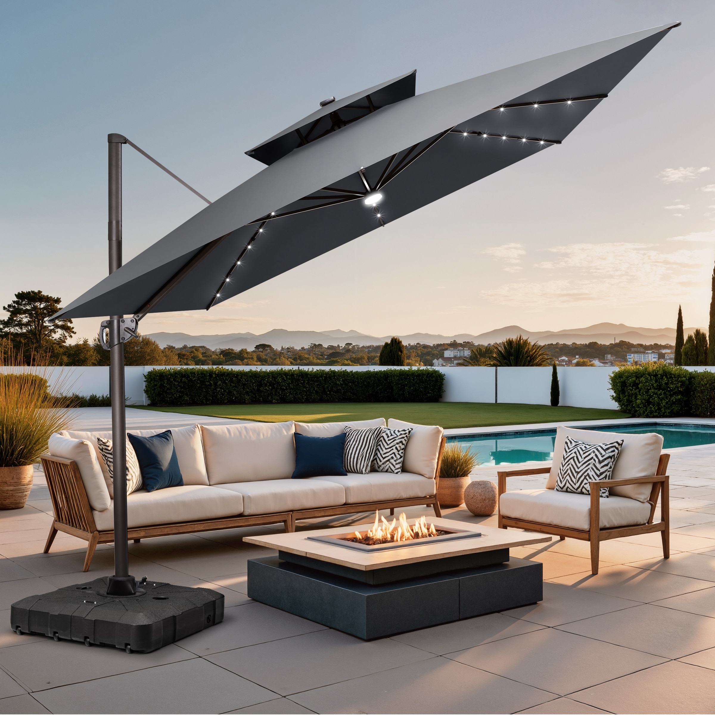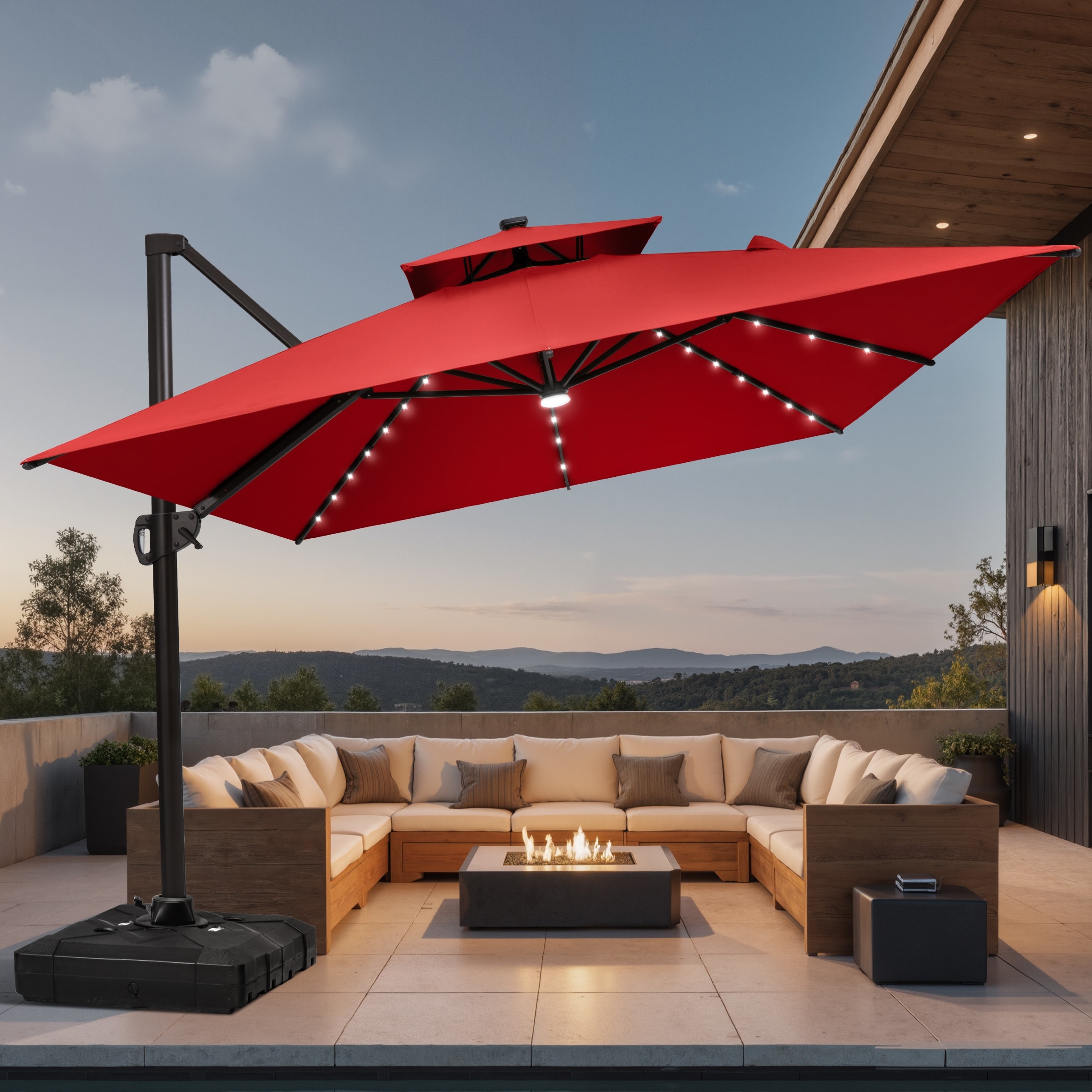 9 X 11 FT Outdoor Patio Cantilever Umbrella with Solar Lights Wheeled Base Double Canopy 360 Rotation Tilt