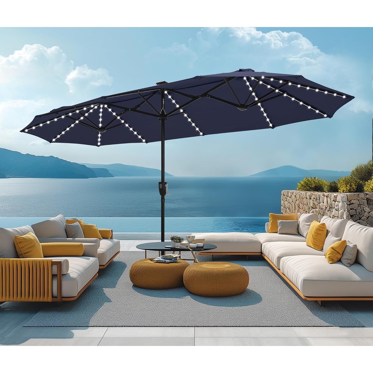 15FT Double Patio Umbrella 48 Solar LED Lights & Auto-Charging Panel