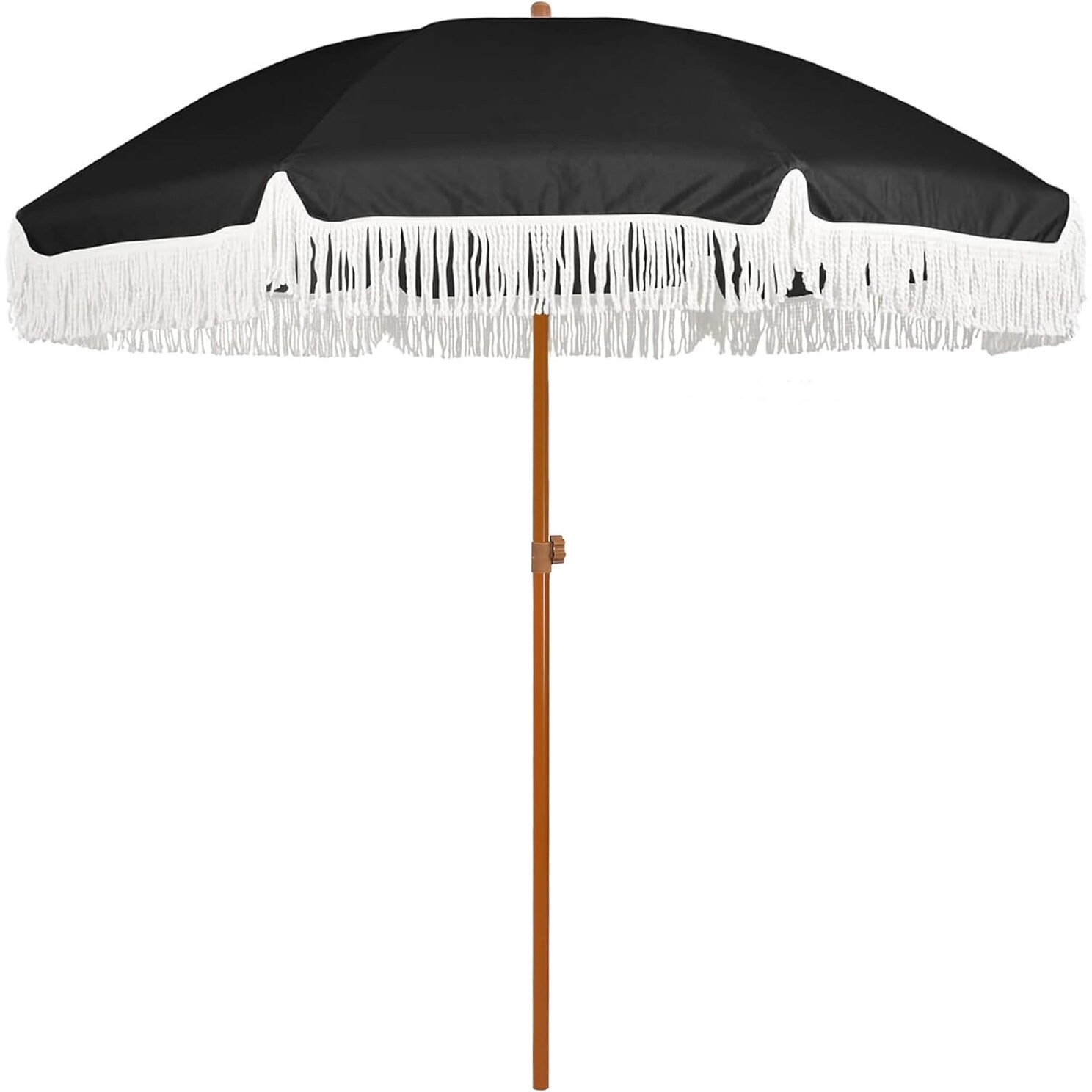7ft Patio Umbrella with Fringe Tassel, UPF50+ UV Protection, Steel Pole and Ribs, Push Button Tilt, Black