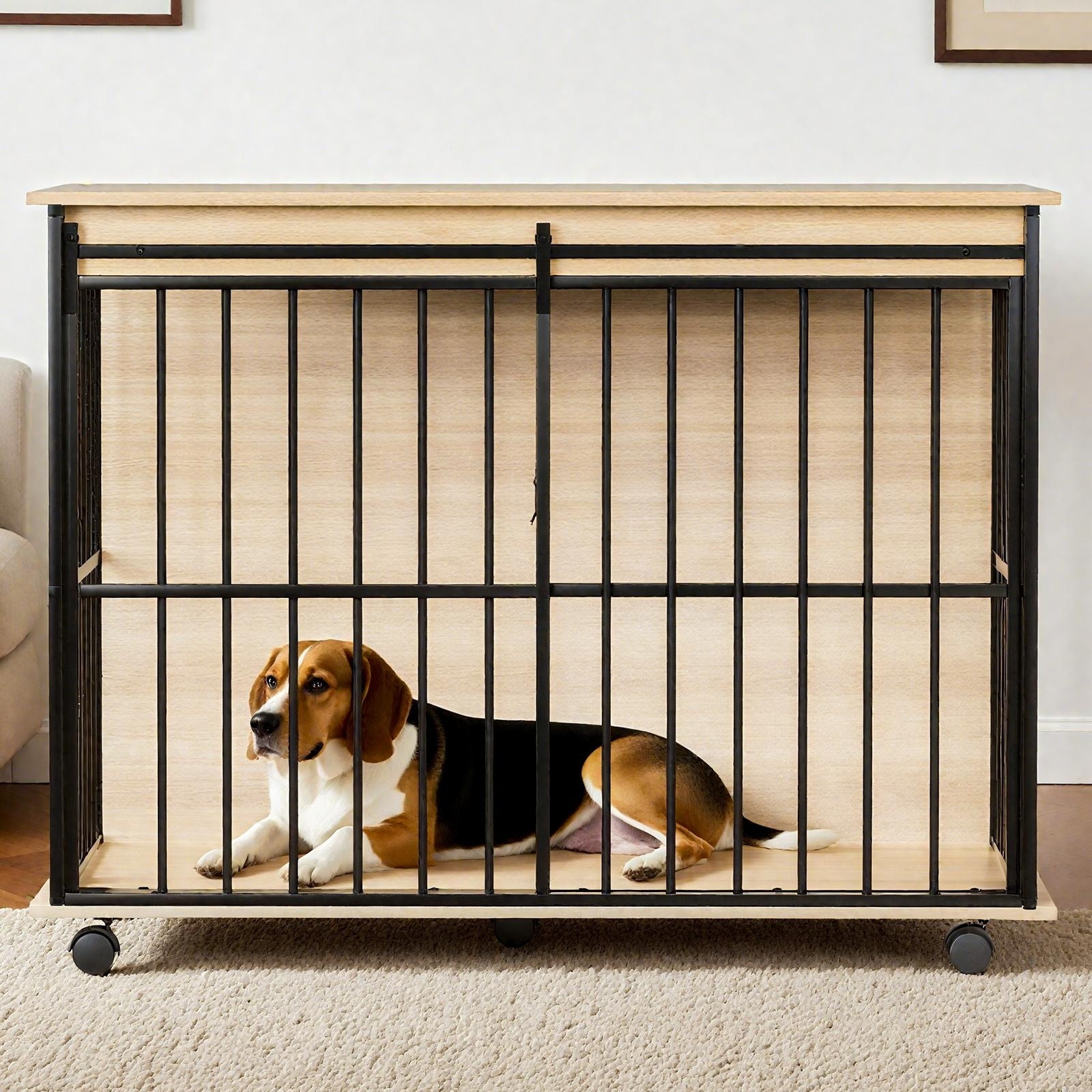Dog Cage Furniture with Cushion, Dog Kennel Indoor with Rotating Feeder Bowls, Heavy Duty Indoor Cage Kennel