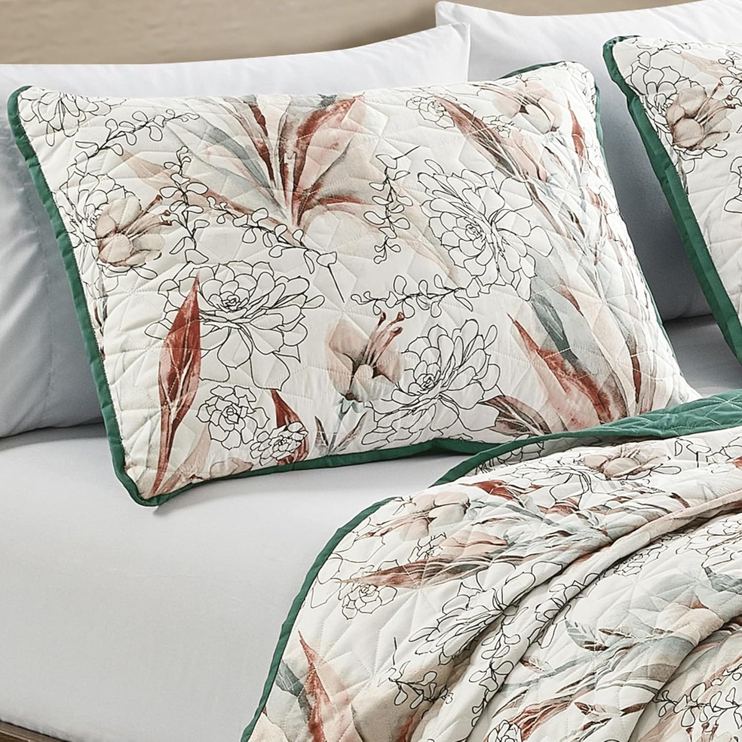 3 Piece Green Beige Floral Reversible Quilt Coverlet Bedspread Bedding Set