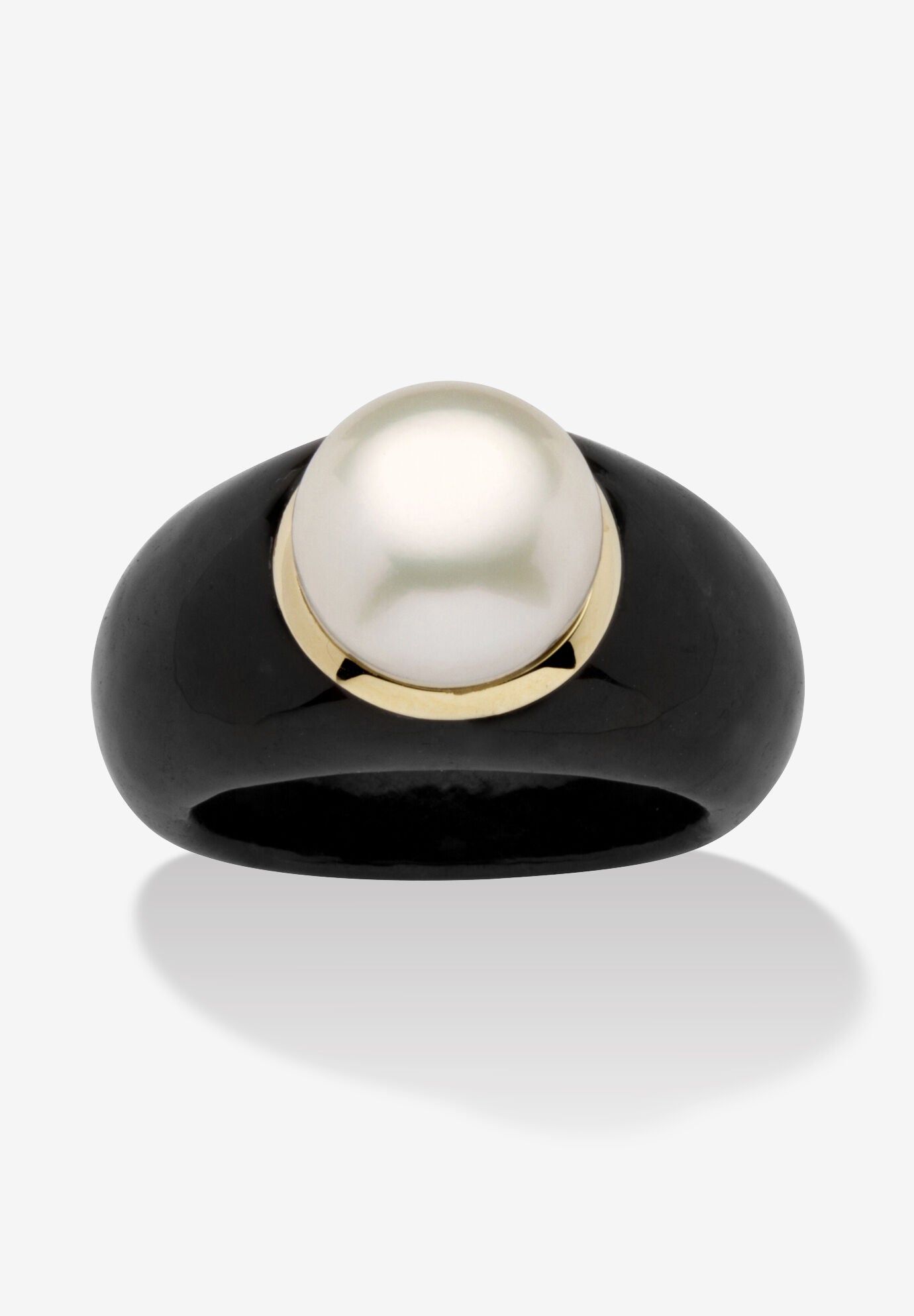 Women's 10K Black Pearl Ring Round Cultured Pearl Black Jade Yellow Gold Ring by PalmBeach Jewelry in Black (Size 9)