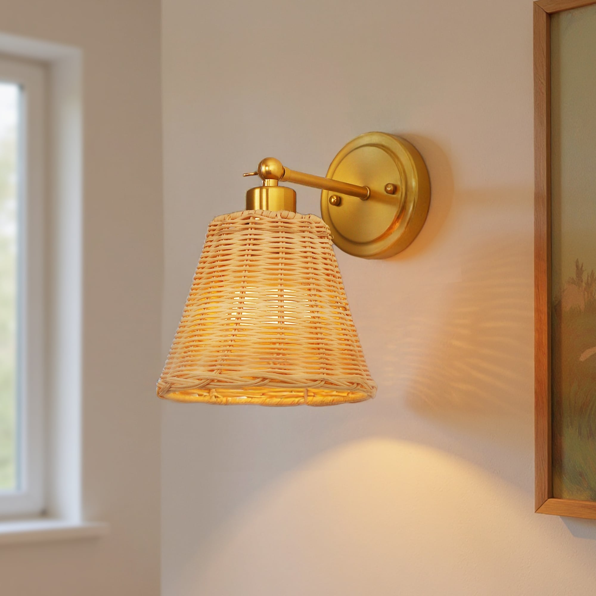 YANSUN Rattan Weave Wall Light Set of 2, Rechargeable Bulb, IR Remote, Copper Finish