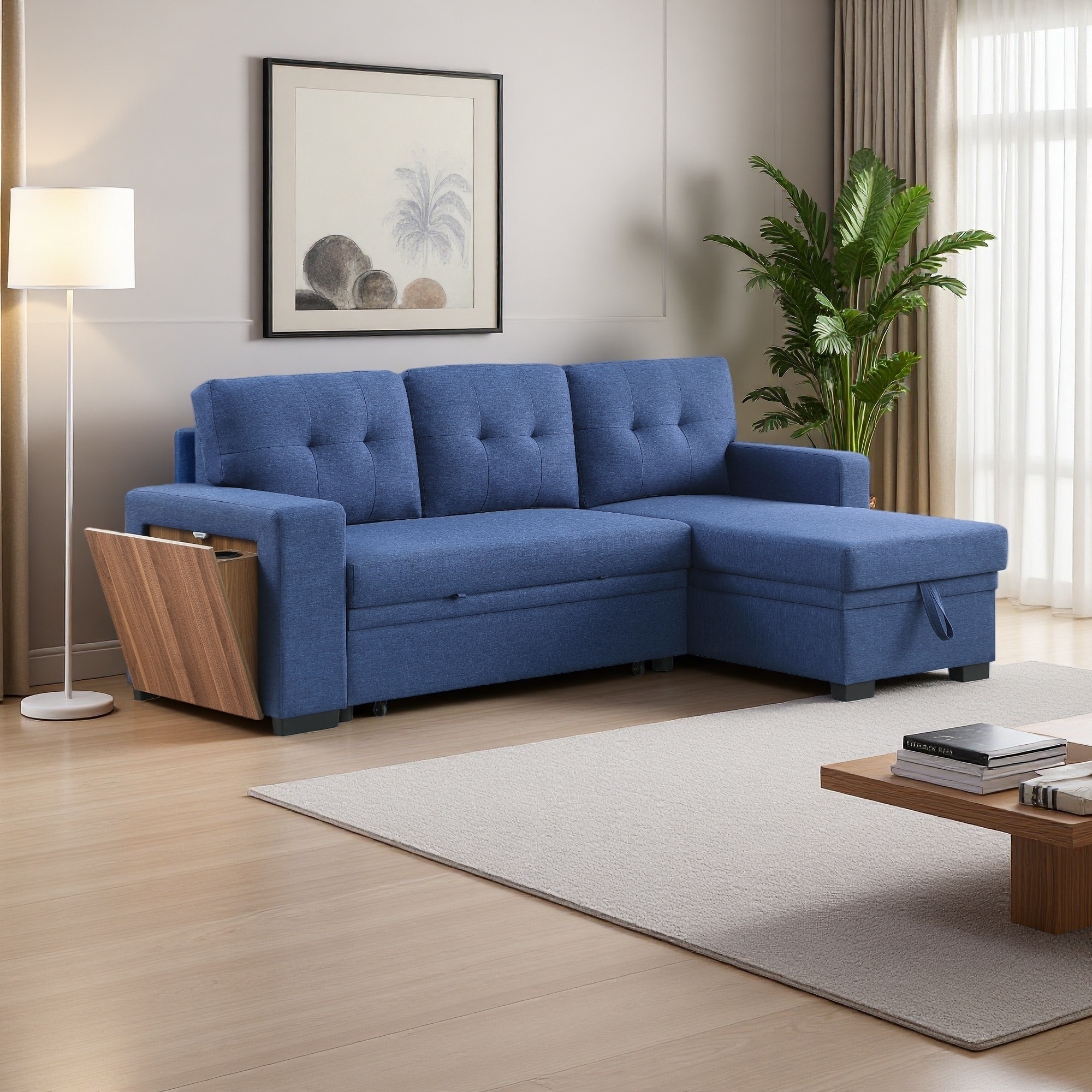 92" Linen 3-Seat Sectional Sofa with Storage Chaise & Pull-Out Sleeper