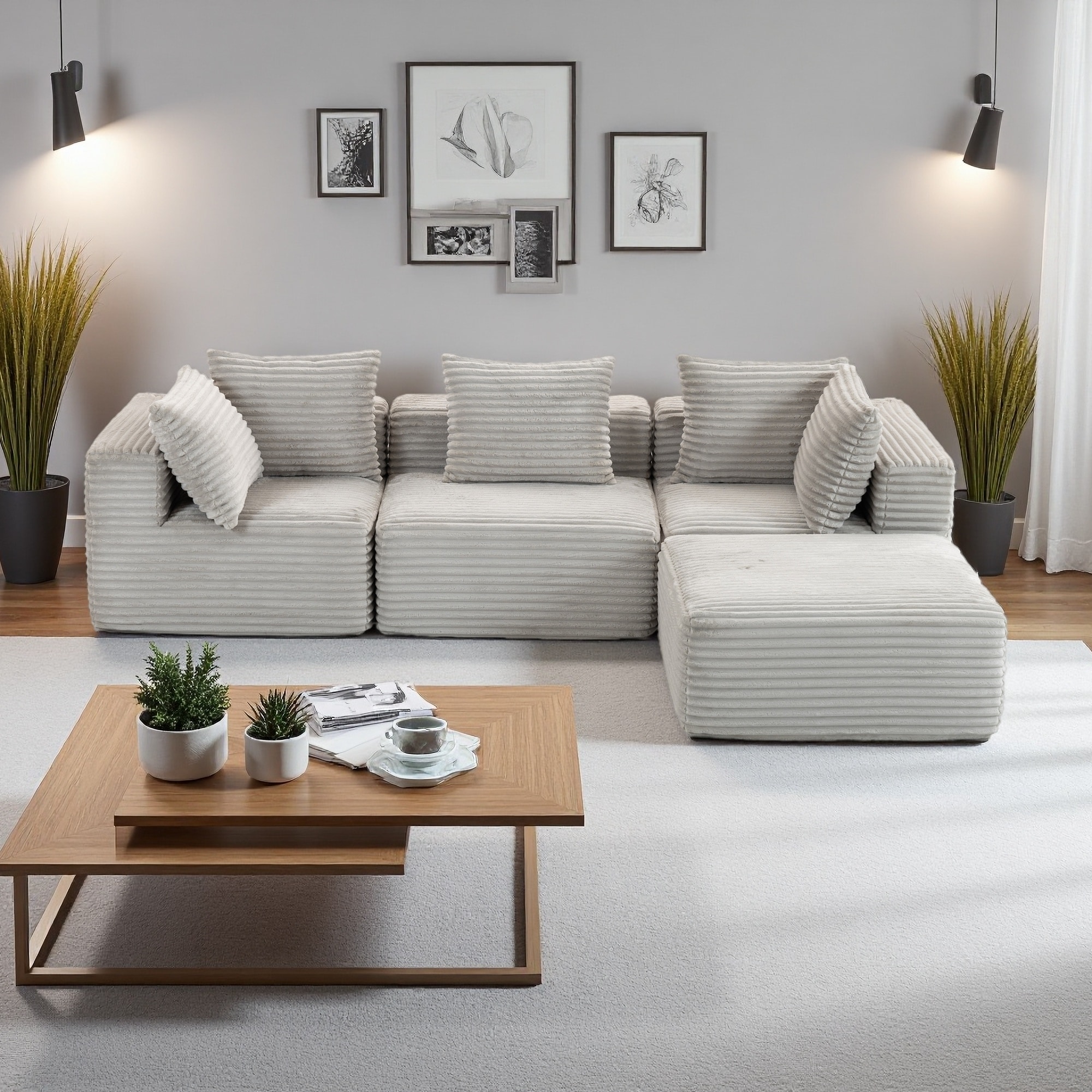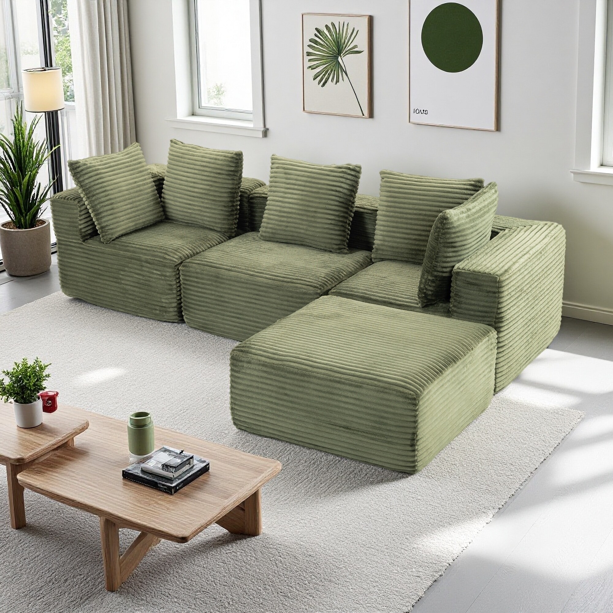 L Shaped Freely Combined Sofa, Modern Living Room 4 Seat Corduroy Upholstered Sectional Couch with Ottoman and 3 Throw pillows