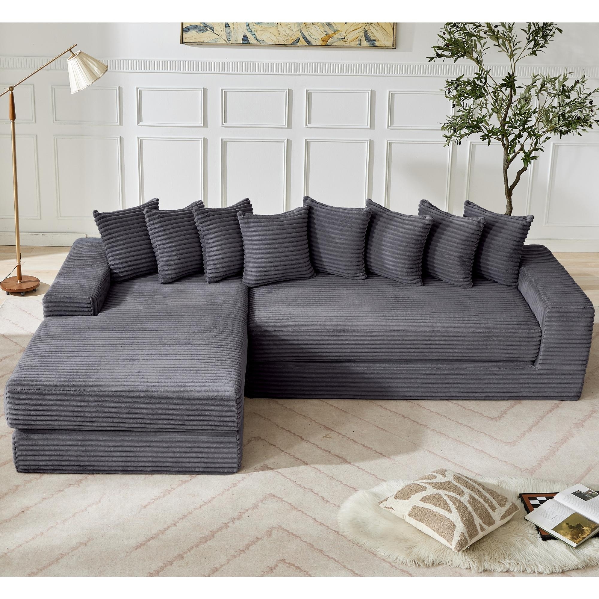 111" Corduroy L-Shape Sectional Sofa with Right Chaise, 8 Throw Pillows and Square Armrests