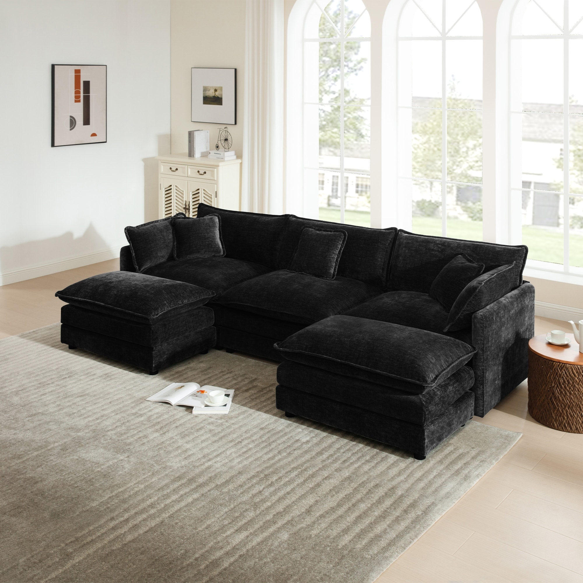 Large Sectional Modular Sofa with 2 Ottomans Chaise Longue and Pillows, Chenille Fabric Sleeper Couch U-Shaped Recliner Couch