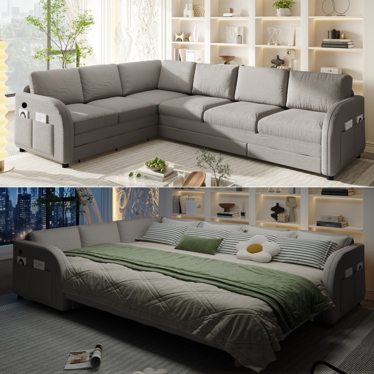 Sectional Sleeper Sofa with Pull Out Bed, Convertible Teddy Fabric Couch with Side Pockets & USB Ports, L Shaped Modular Couches