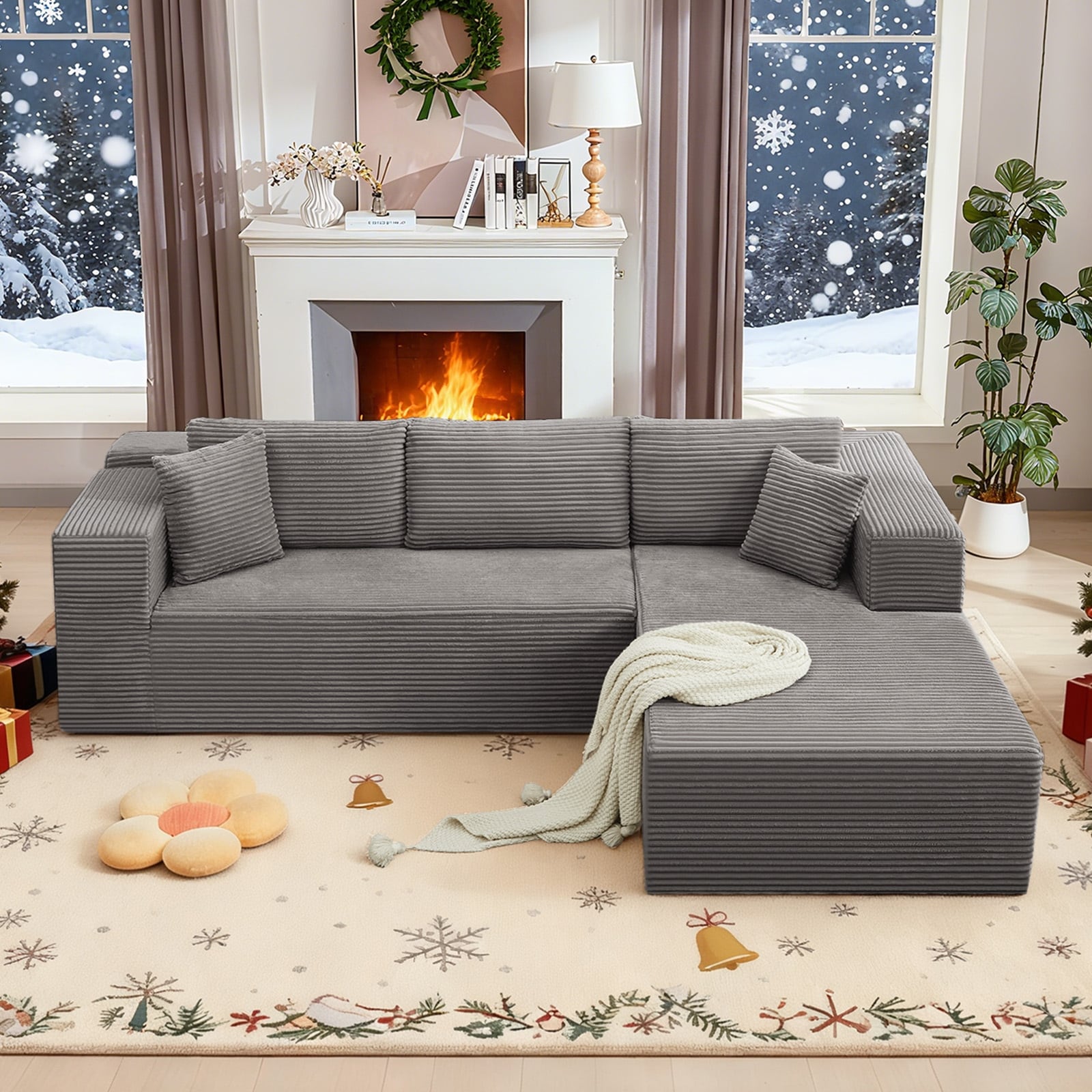 2-Piece Corduroy Upholstered Sectional with 2 Throw Pillows in Fog