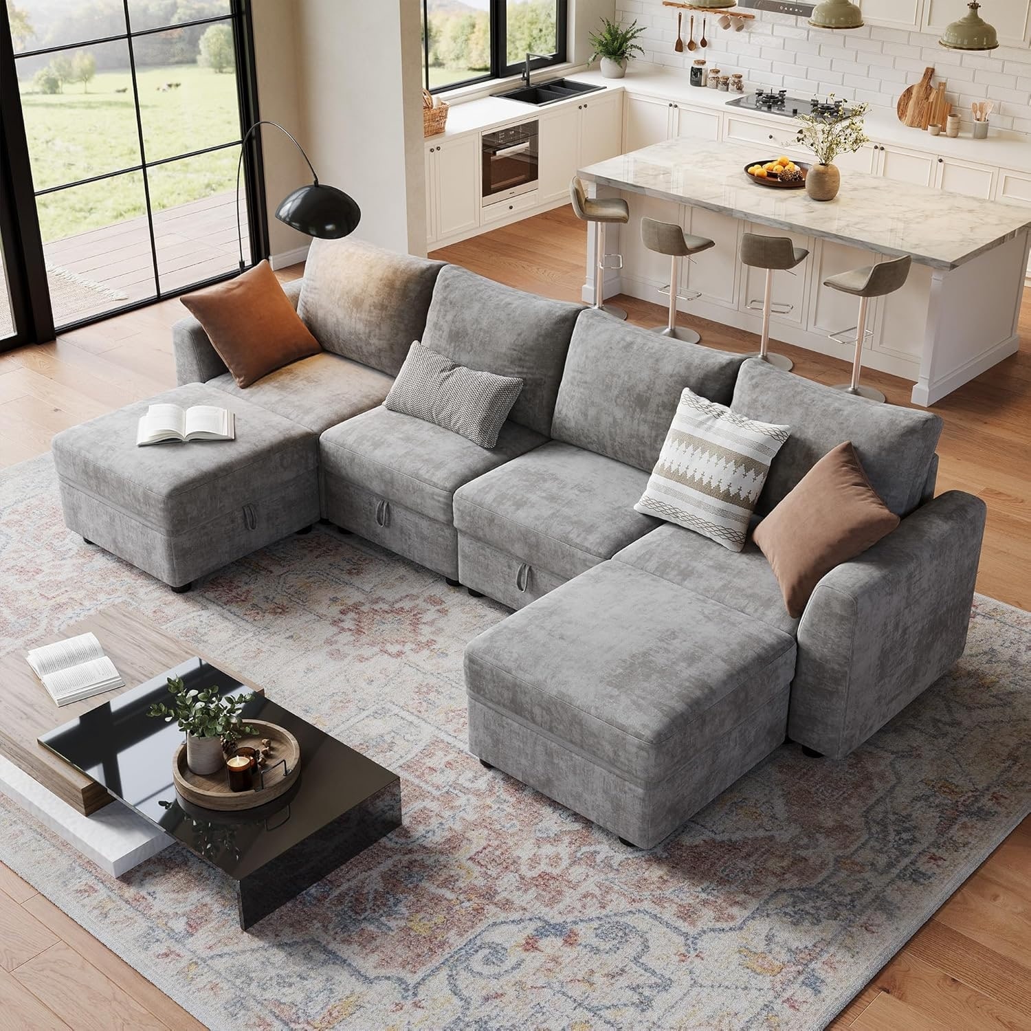 130" Large U-Shaped Sectional Sofa with 2 Movable Ottomans, Chenille Fabric, Modular Design for Living Room, Home Theater