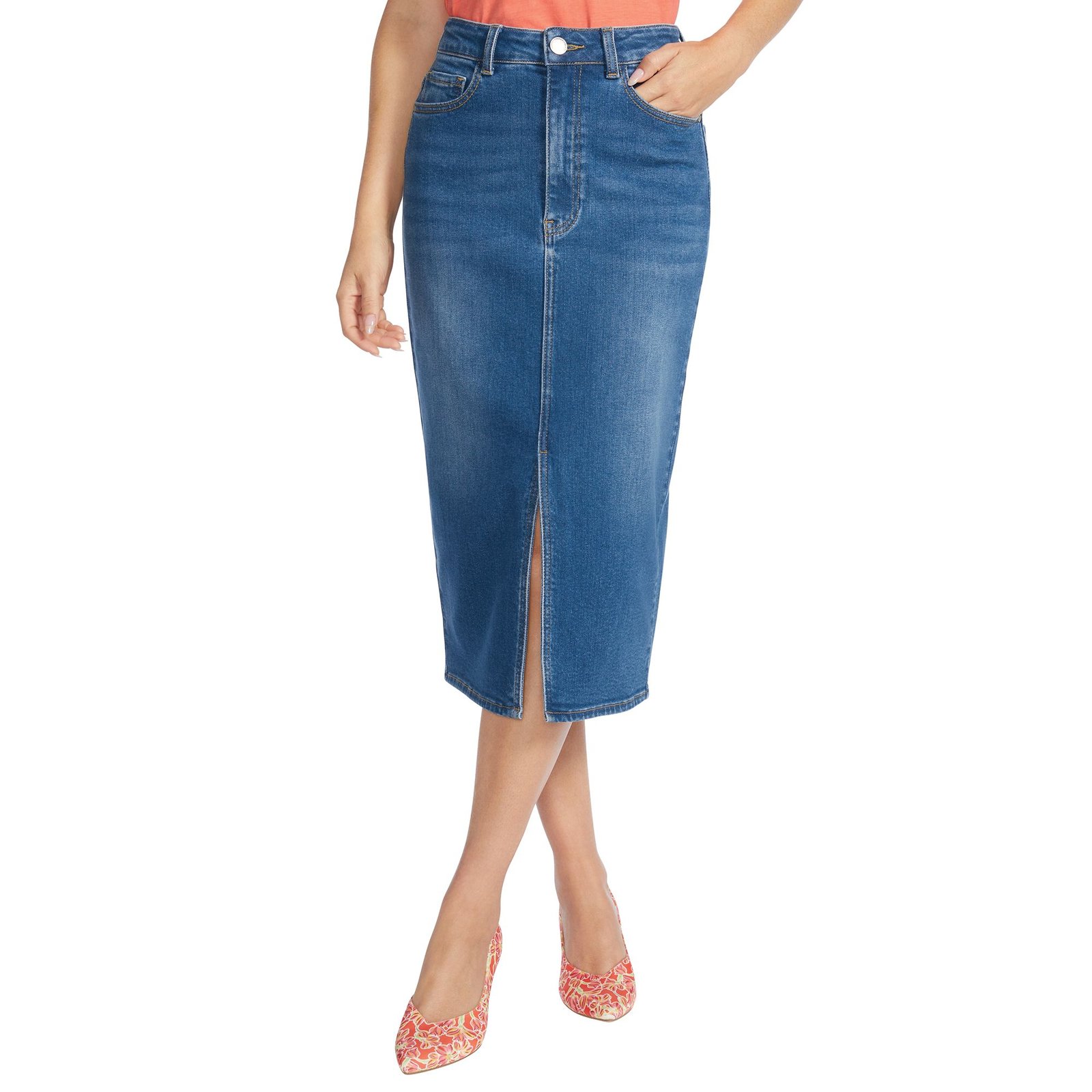 Masseys Midi Denim Skirt (Size 10) Medium Wash, Cotton,Polyester,Spandex