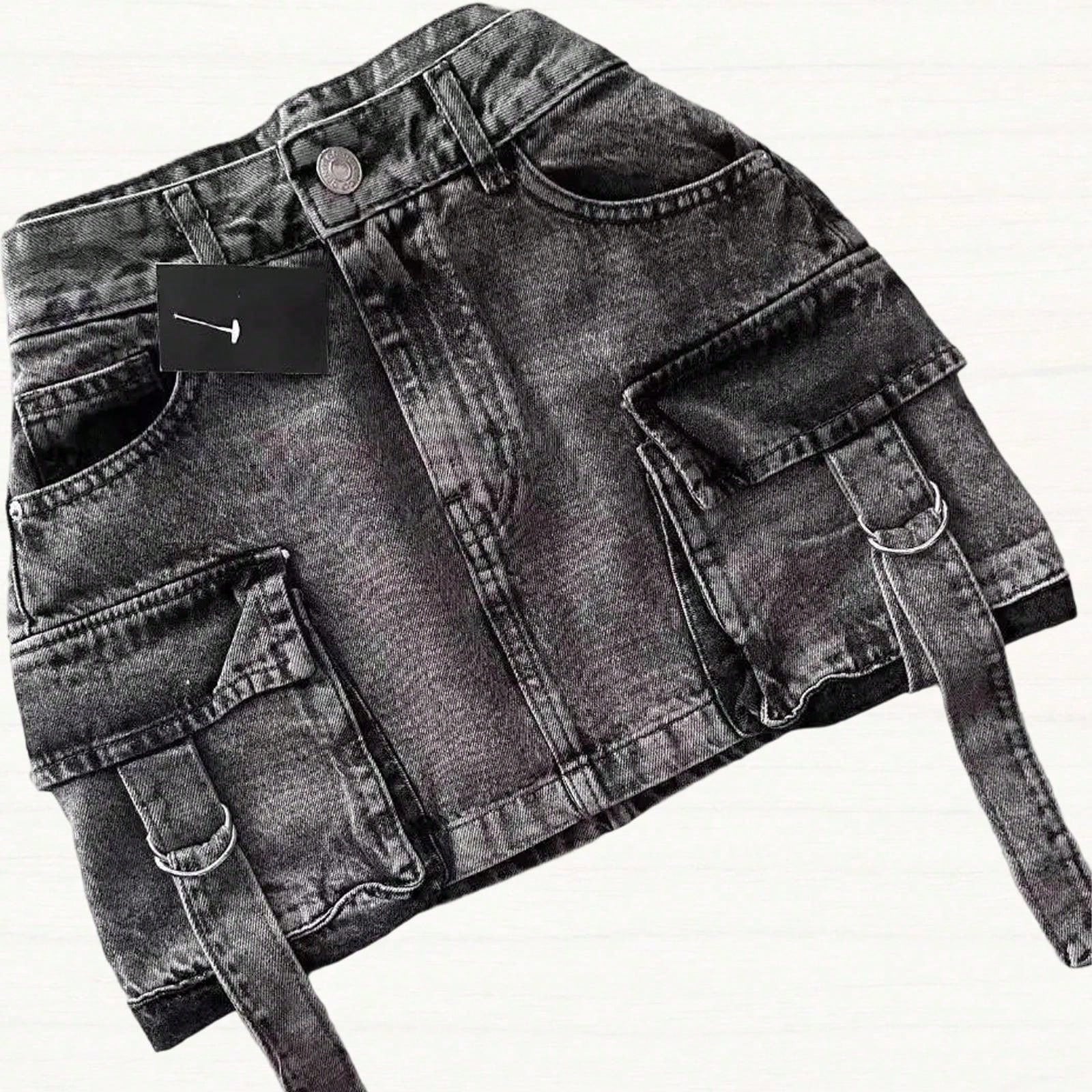 Vintage Goth Denim Skirt, Y2k Harajuku Mini Skirt With Multiple Pockets, Plaid Lining, Womens Casual Streetwear black l