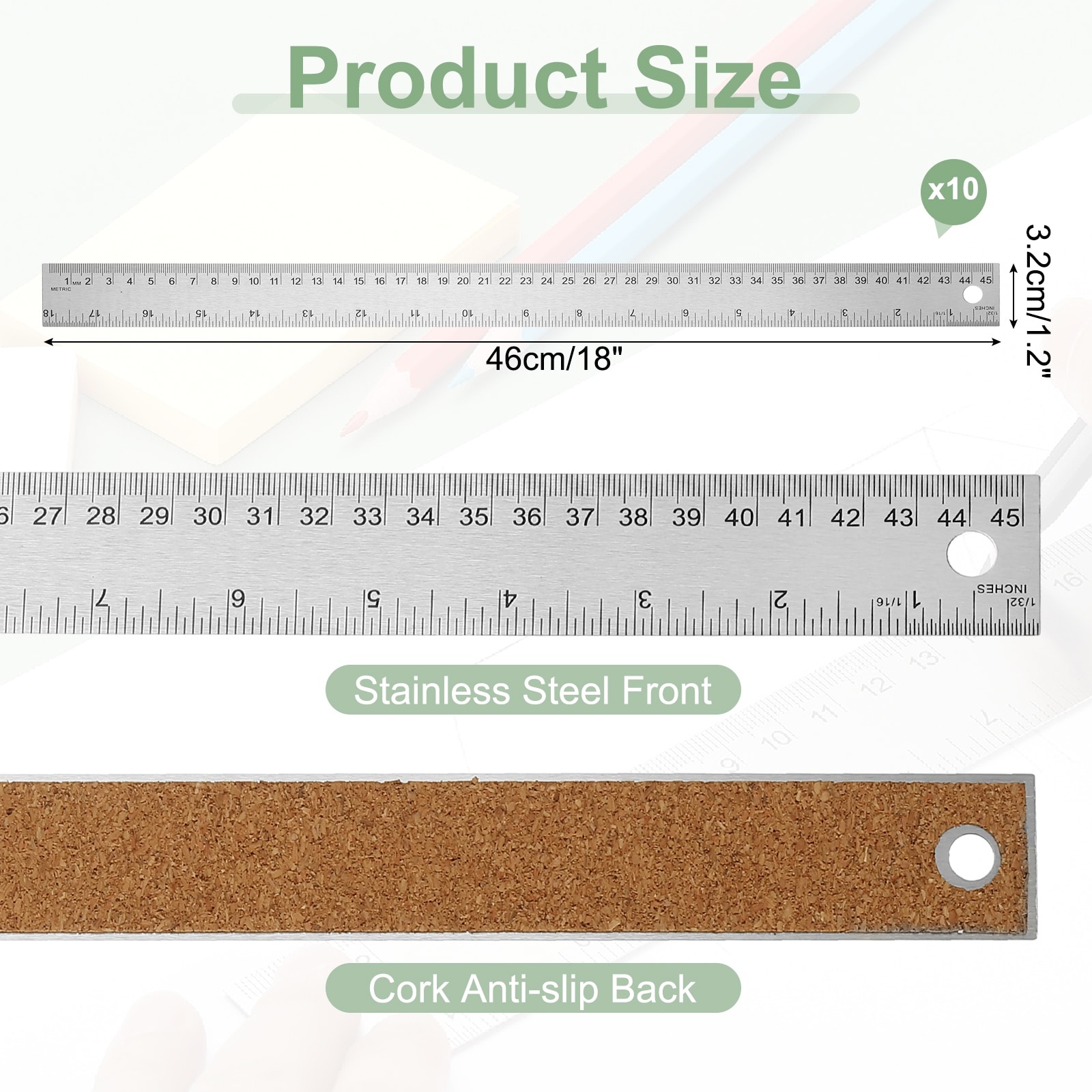Stainless Steel Ruler Cork Backed, 10Pcs 18 Inch Straight Edge Ruler - Silver