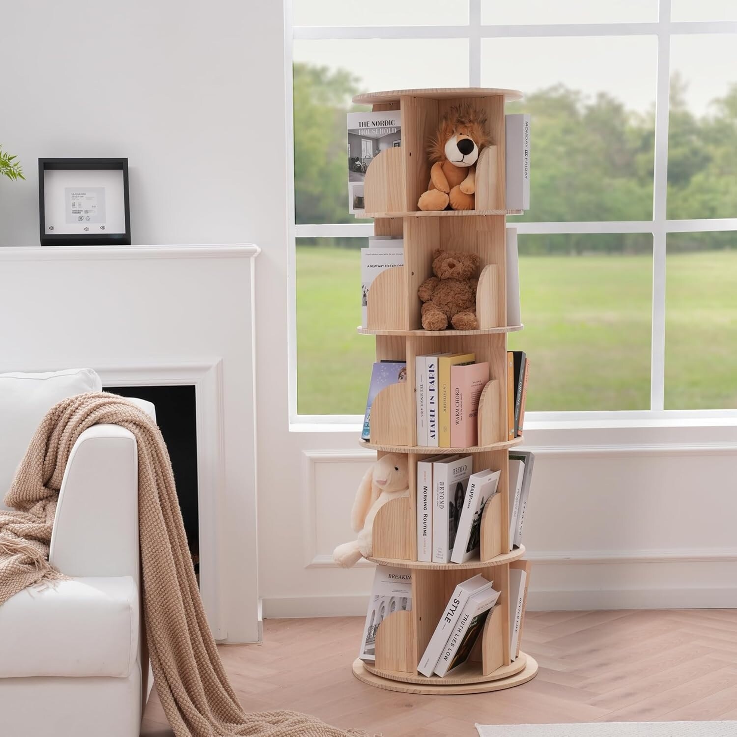 5-Tier Rotating Corner Bookshelf, Solid Wood, 360° Display, Space-Saving Organizer for Kids Room, Living Room, Bedroom