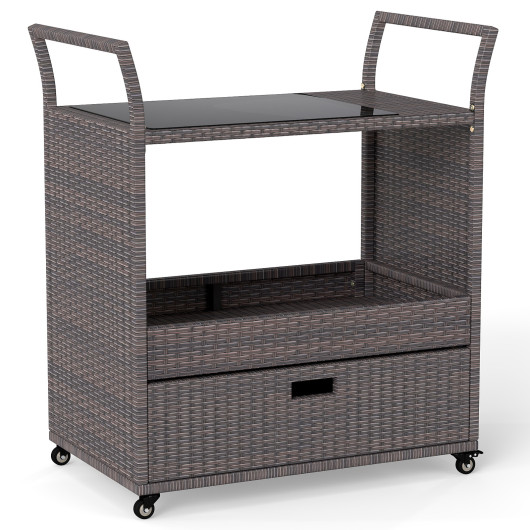 Costway Outdoor Wicker Bar Cart Table with Tempered Glass Top