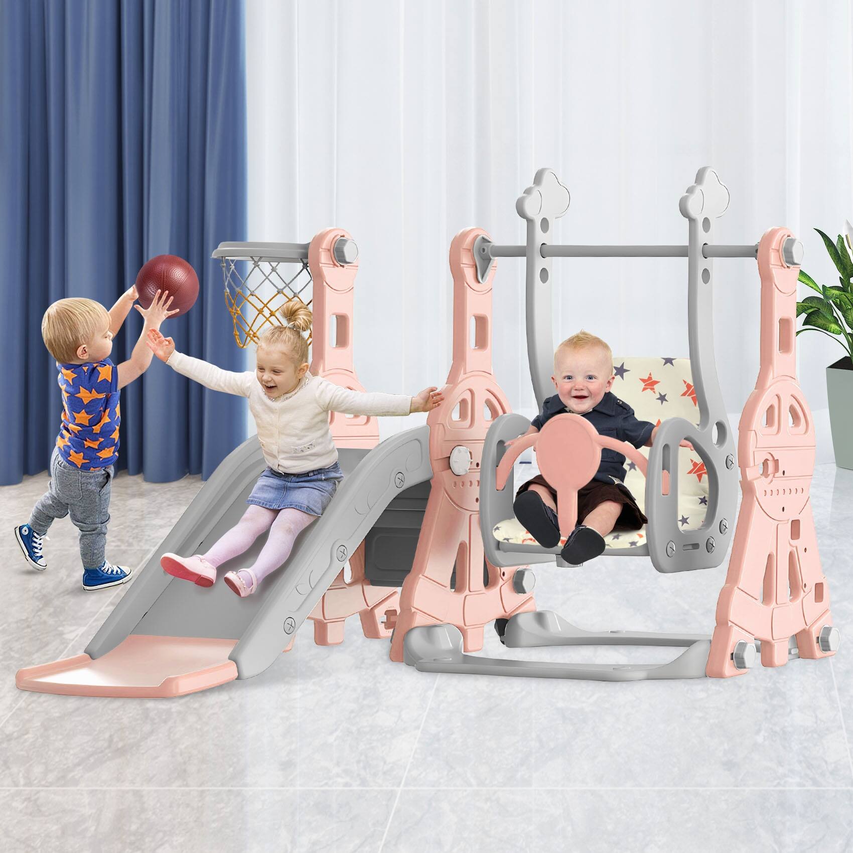 Pink 4 in 1 Toddler Slide and Swing Set, Kid Slide for Toddlers Age 1-3, Indoor Outdoor Slide Toddler Playset Toddler Playground
