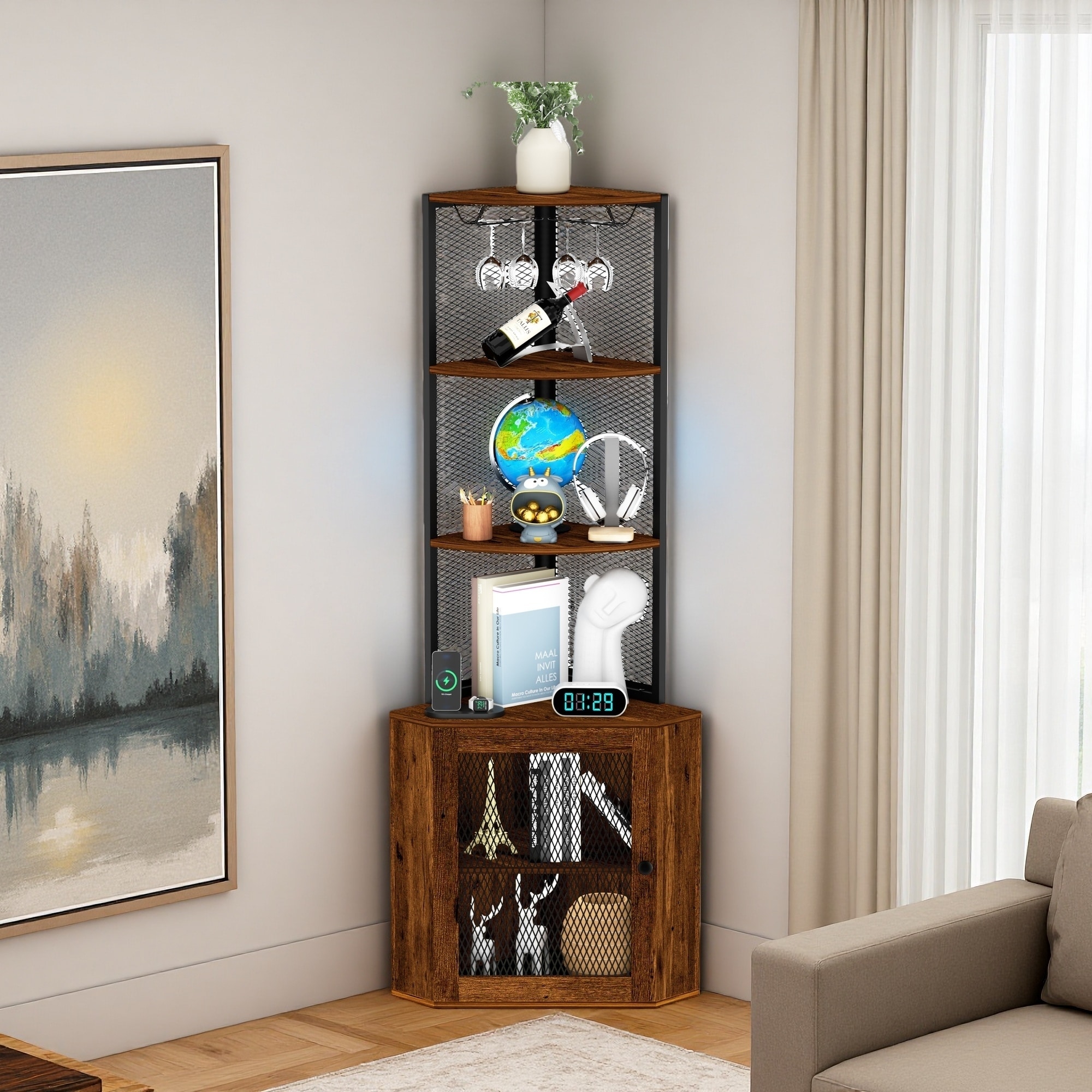 64.8"H 6-Tier Corner Cabinet with Wine Rack, USB & AC Outlets