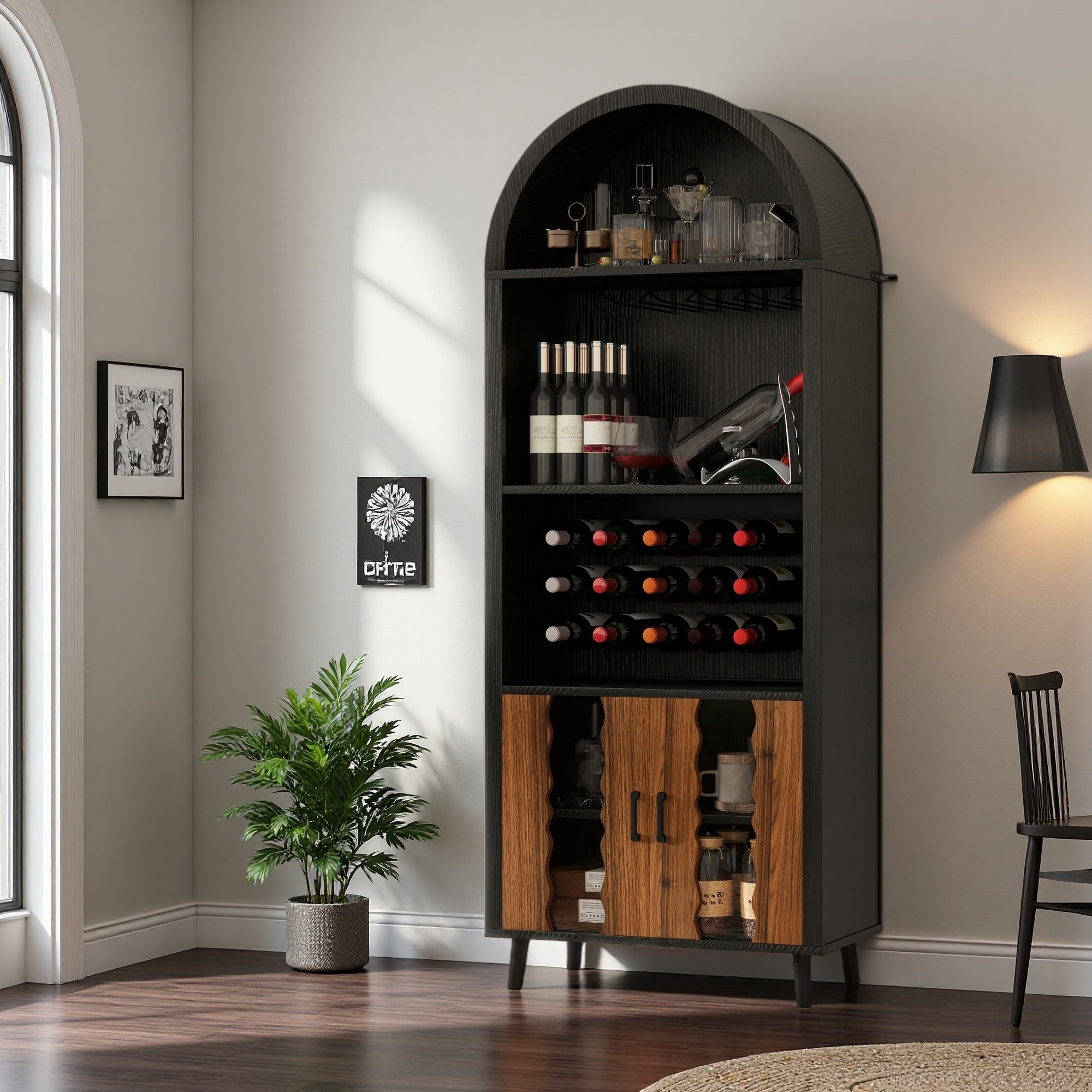 70.87"H Farmhouse Arched Wine Bar Cabinet, Tall Arched Display Cabinet with Wine Rack, Whiskey Station, Glass Holder, Coffee Bar