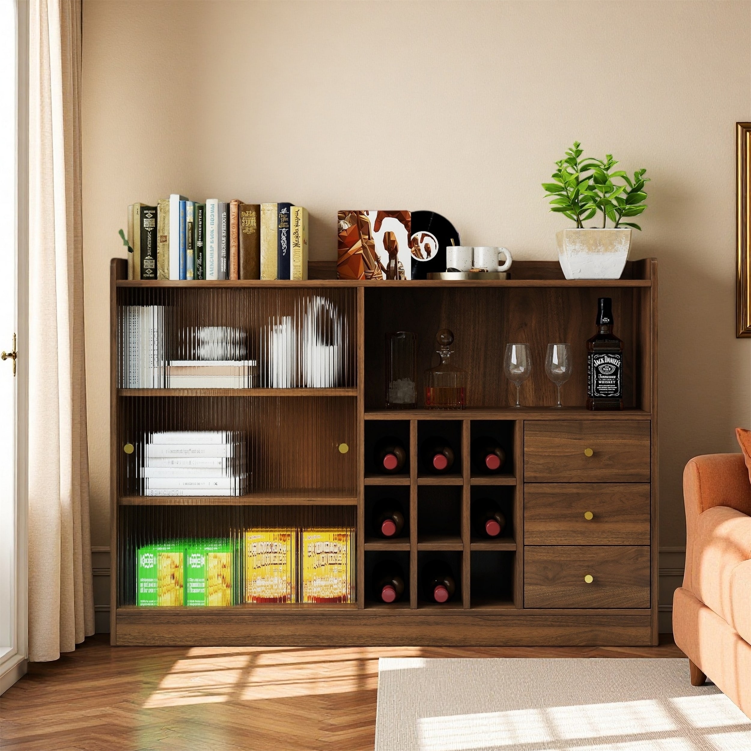 9-Bottle Wine Bar Cabinet, Sliding Striped Glass Door Sideboard