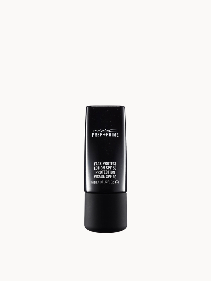 The MAC Prep + Prime Face Protect SPF 50 is a lightweight, antioxidant-rich sunscreen lotion that provides broad spectrum UVA and UVB protection with additional skincare benefits for a multi-tasking action.The fluid, non-drying formula instantly absorbs into skin without feeling oily or greasy, creating a comfortable and breathable shield powered by high level Zinc Oxide-based sun filters, with humectants and water binding agents helping to optimise moisture levels for a hydrated, radiant surface. Apply as a priming base prior to makeup application to create a soft-focus effect, with the addition of botanic extracts and conditioning agents helping to minimise the look of dark spots and discolouration with continued use.Dermatologist and ophthalmologist tested. Non-acnegenic.