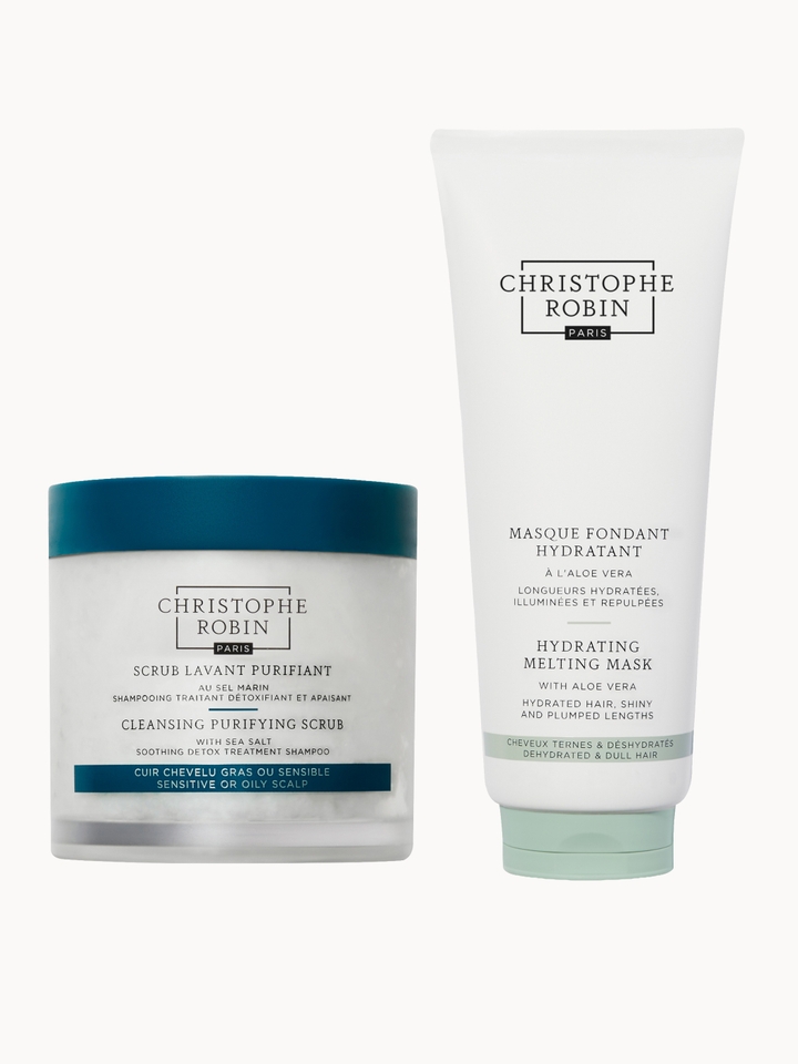 A 2-step routine to gently detoxify the scalp and deeply hydrate and illuminate hair.Set Contents:The Cleansing Purifying Scrub with Sea Salt 250mlAn exfoliating shampoo formulated to detoxify and soothe sensitive or oily scalps.The Hydrating Melting Mask with Aloe Vera 200mlMelts beautifully into hair, helping to enhance shine and reduce frizz.