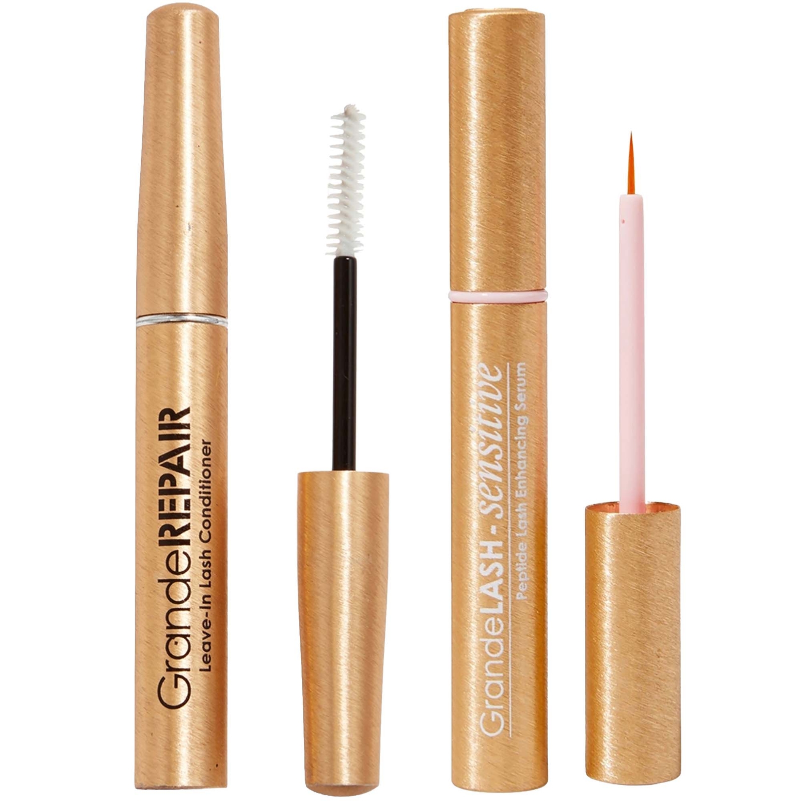 GRANDE Cosmetics GrandeLASH-Sensitive Peptide Lash Enhancing Serum: Developed for sensitive eyes by America's #1 Lash & Brow Serum brand*, this gentle, yet powerful lash serum supports visibly thicker, longer-looking lashes & less lash fall out in just 6 weeks. Infused with Grande's LashCatalystTM Peptide Complex, calming botanicals & fortifying vitamins, its clinically studied formula nourishes the delicate lash line & improves the look of short, thinning, or brittle lashes. It's the solution for a gentle lash upgrade, backed by real results, no compromise. GRANDE Cosmetics GrandeREPAIR Leave-In Lash Conditioner: Did you know you naturally lose 1-2 lashes daily? Give them the extra care they need with this must-have lash fixer upper. GrandeREPAIR is an invisible leave-in conditioner that helps to protect, strengthen, fortify, and soften lashes. Infused with WidelashTM, a biotin peptide proven to help protect against lash fallout, breakage, and environmental toxins. This conditioning lash mask is a lash saver! KEY BENEFITS For the appearance of stronger, softer, more fortified and healthier looking lashes Less lash fallout, brittleness, and breakage Helps to protect against environmental toxins, frequent mascara application, harsh eye makeup removers, eyelash curler damage Helps mascara apply more easily Cruelty-free In a 6 week consumer study with GrandeREPAIR: 96% saw reduced brittleness 93% saw less lash breakage 83% saw less lash fallout *Based on a 6 week consumer study with 31 subjects. Results will vary. | GRANDE Cosmetics GrandeLASH-Sensitive Peptide Lash Serum + GrandeREPAIR Leave-In Lash Conditioner Duo | Dermstore