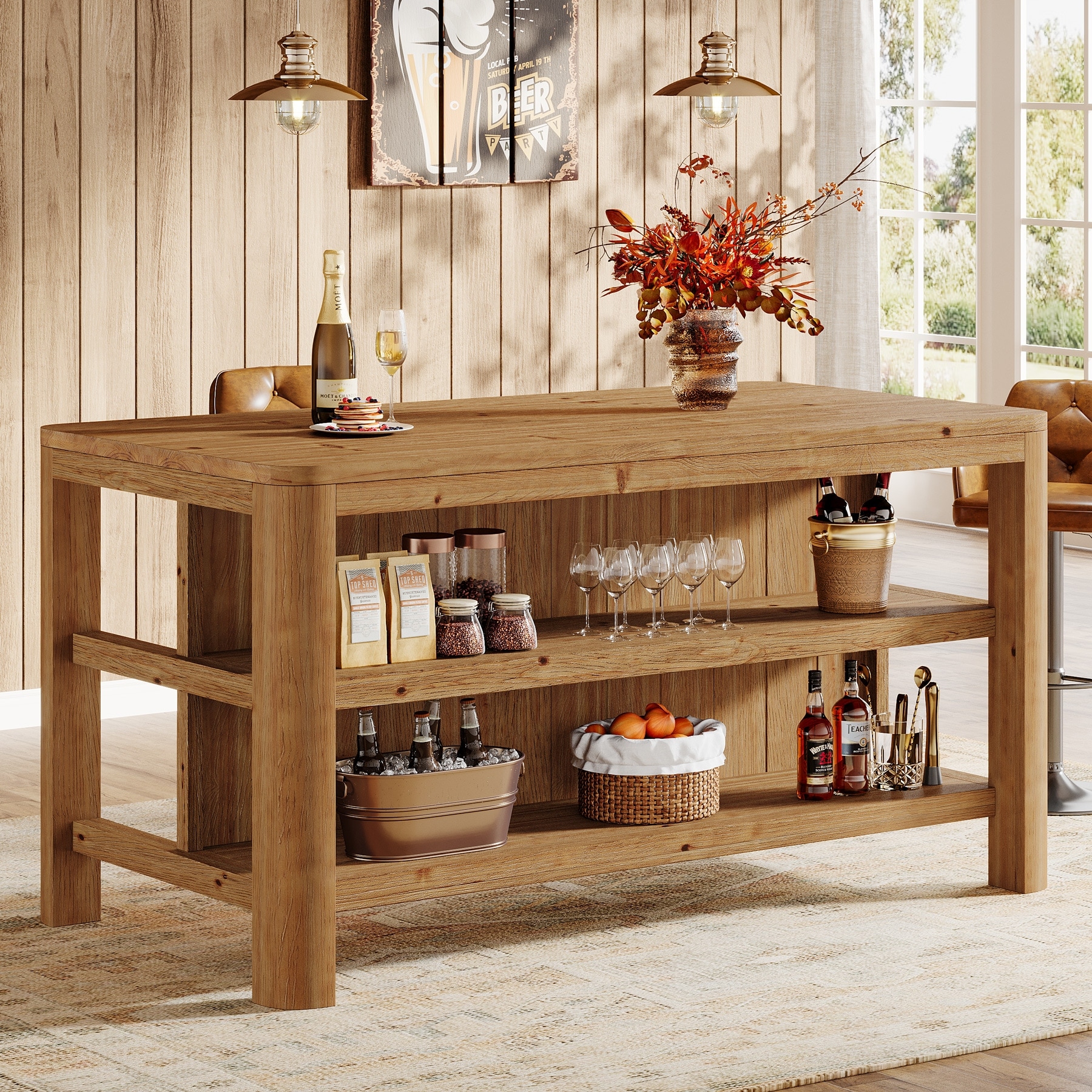 63-Inch Solid Wood Bar Table with Storage Shelves - 63.0" W x 28" D x 35.4" H