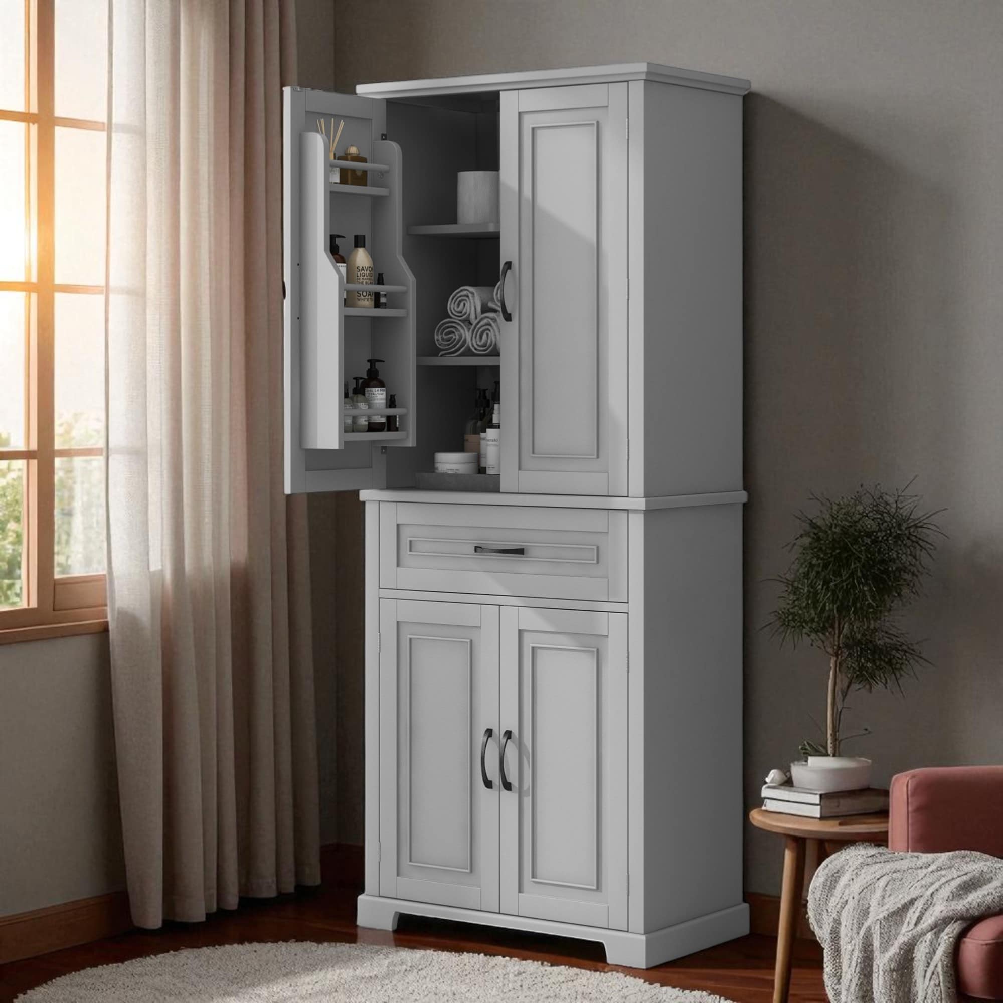 72" Tall Storage Cabinet with 4 Doors, Drawer, Adjustable Shelf & Side Racks, Painted MDF Freestanding Pantry