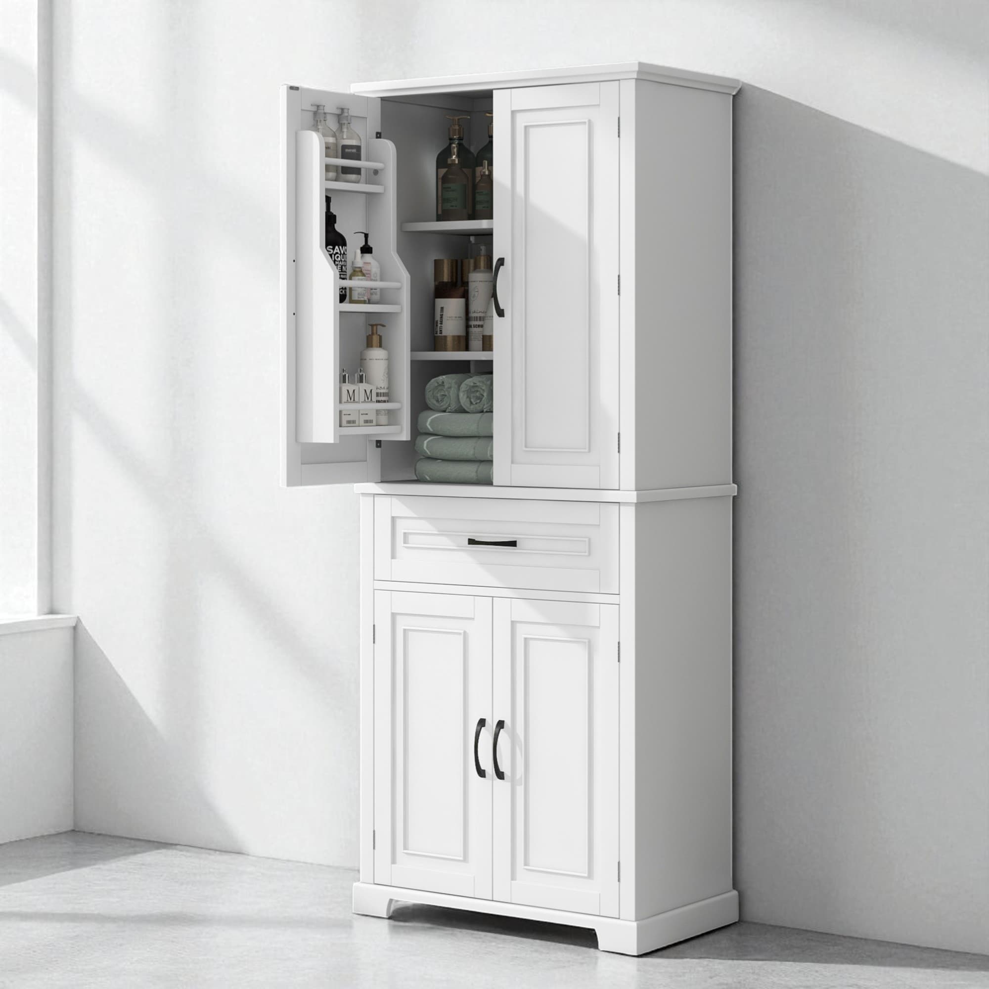 72" Tall Storage Cabinet with 4 Doors, Drawer, Adjustable Shelf & Side Racks, Painted MDF Freestanding Pantry