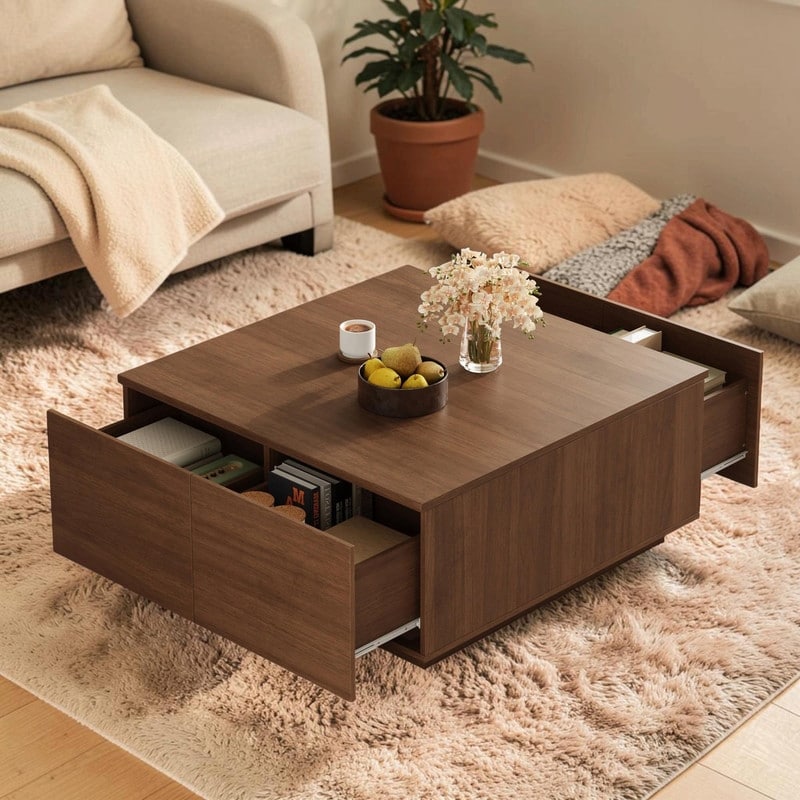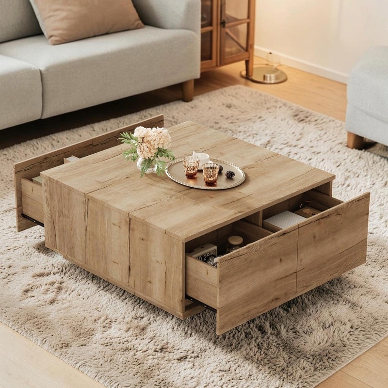 33.25" Square Coffee Table with 4 Drawers, Modern Storage Center Table for Living Room