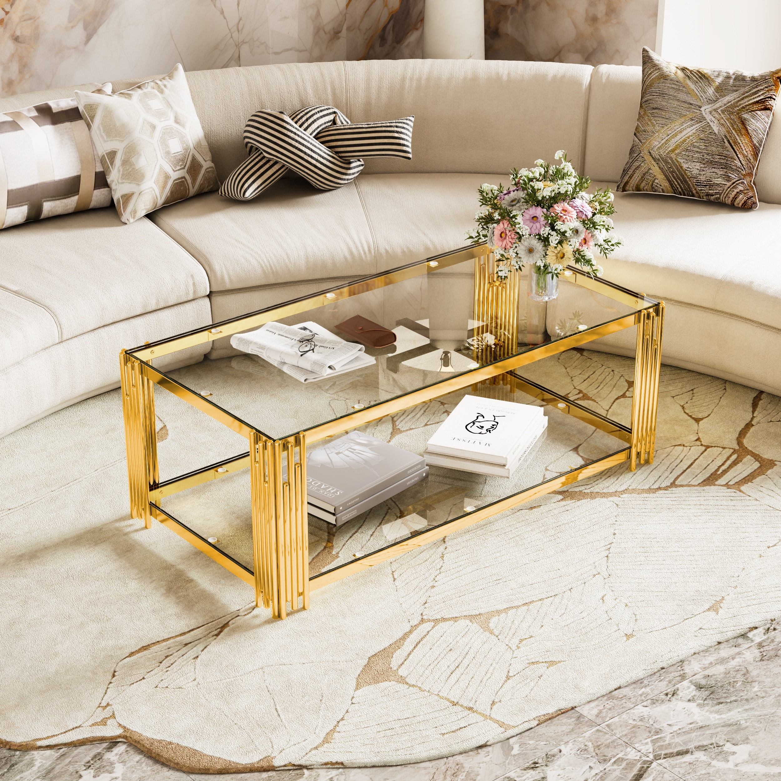 Modern Rectangle Mirror Coffee Table: Asymmetrical Metal Design, Gold Finish & Lower Shelf – 47.5" Elegance.