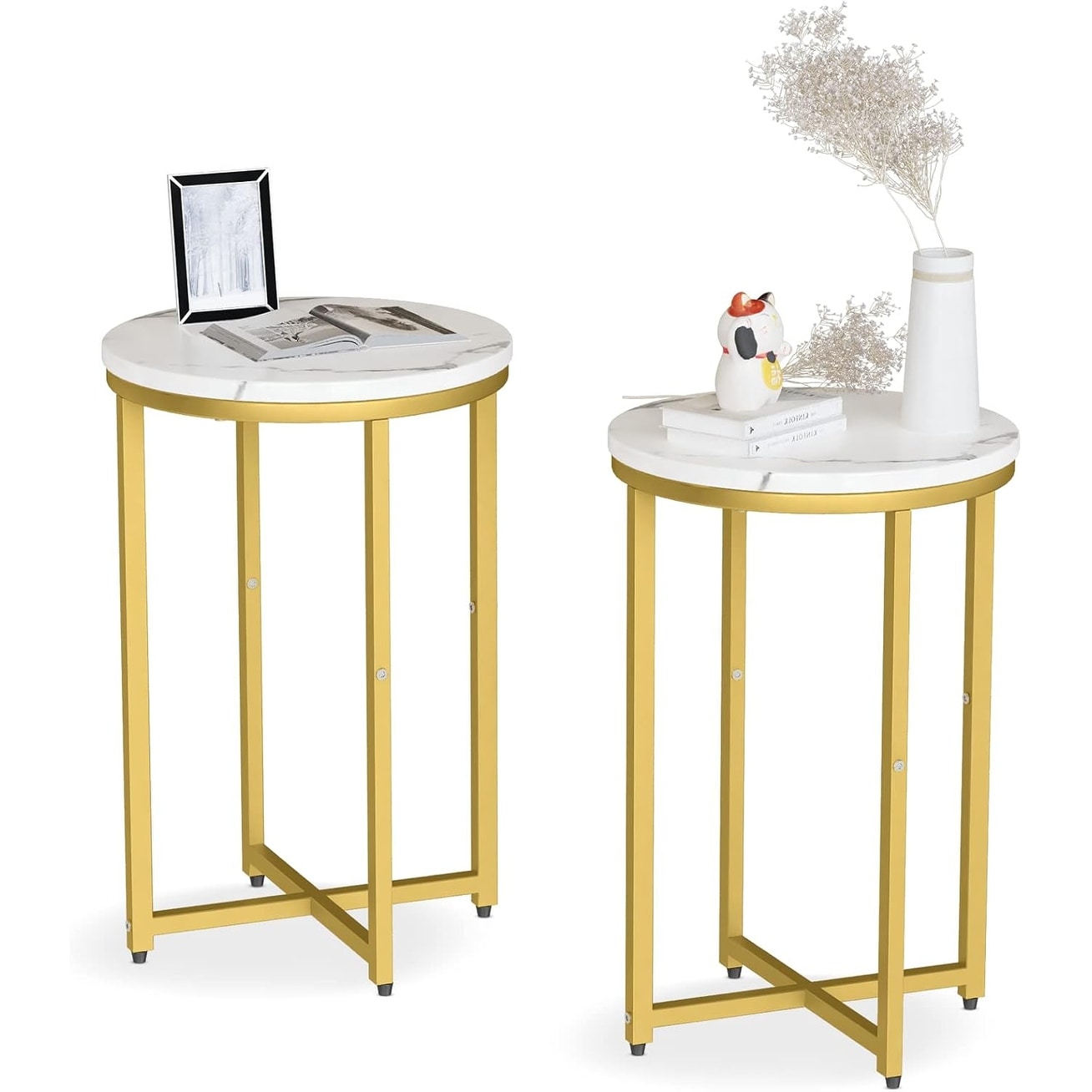 Round Side Table Set of 2, Modern White Marble-Look Tables with X-Frame, 15.75D x 24.41H